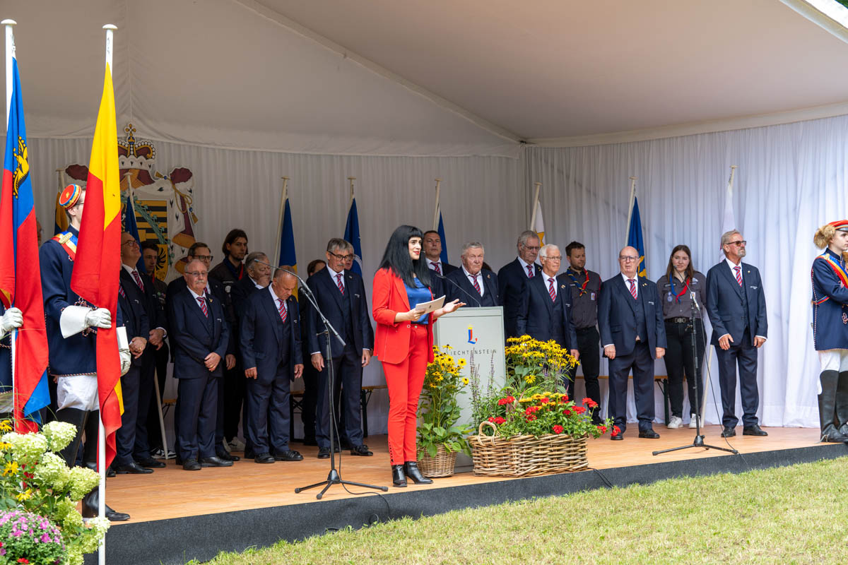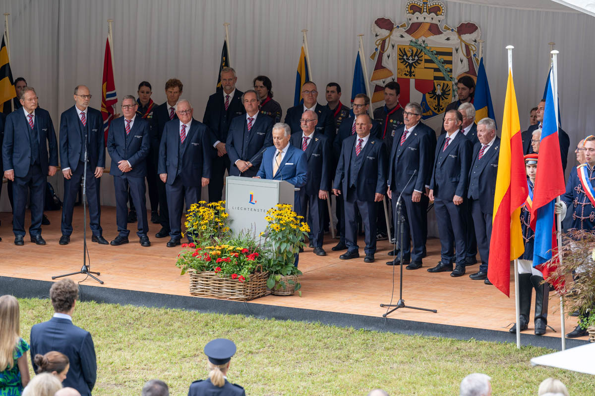 Offizieller Staatsakt mit den Ansprachen von S.D. Erbprinz Alois von und zu Liechtenstein und Landtagspräsident Albert Frick. Feierlich umrahmt von der Harmoniemusik Triesenberg, zusammen mit dem MGV Sängerbund Vaduz. Die Moderatorin Christiani Wetter führte durch den Staatsakt. Fotos: © exclusiv, Silvia Abderhalden, Melanie Hasler