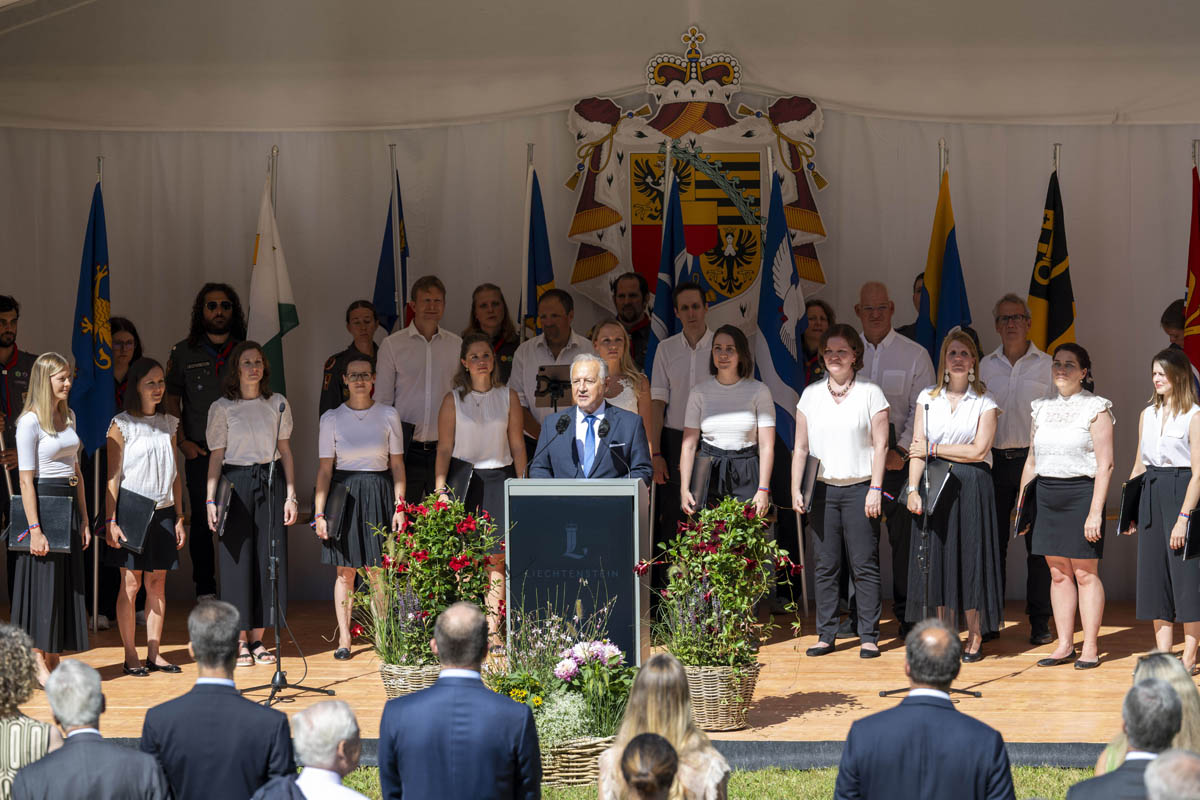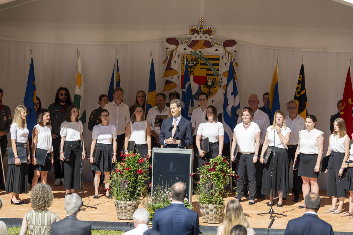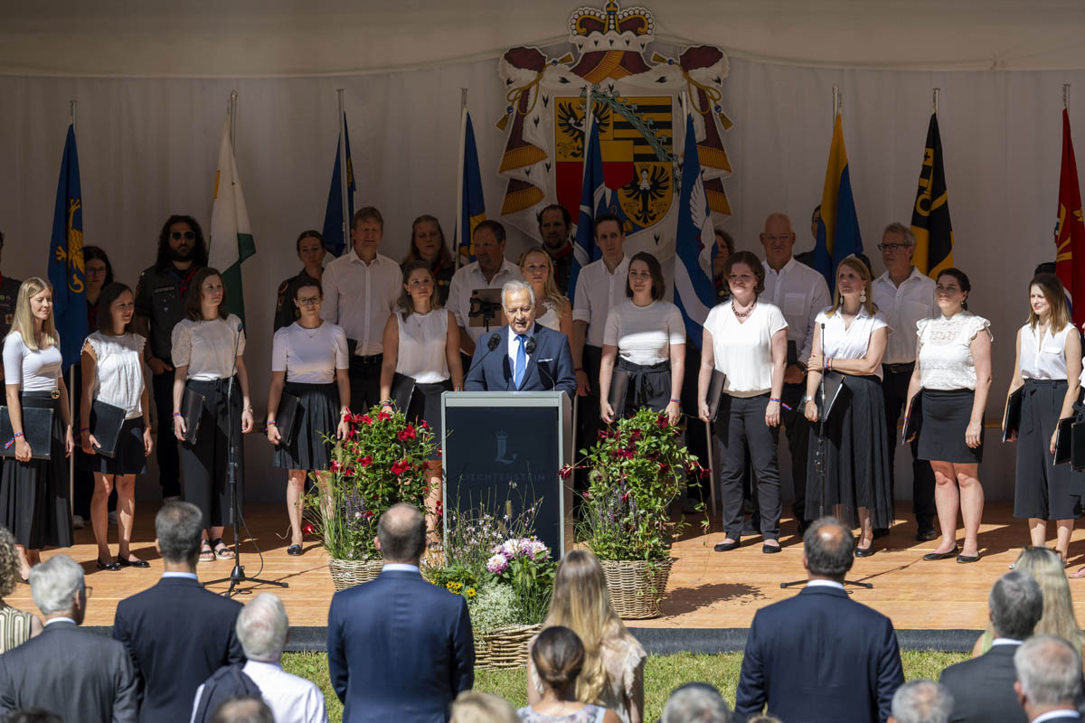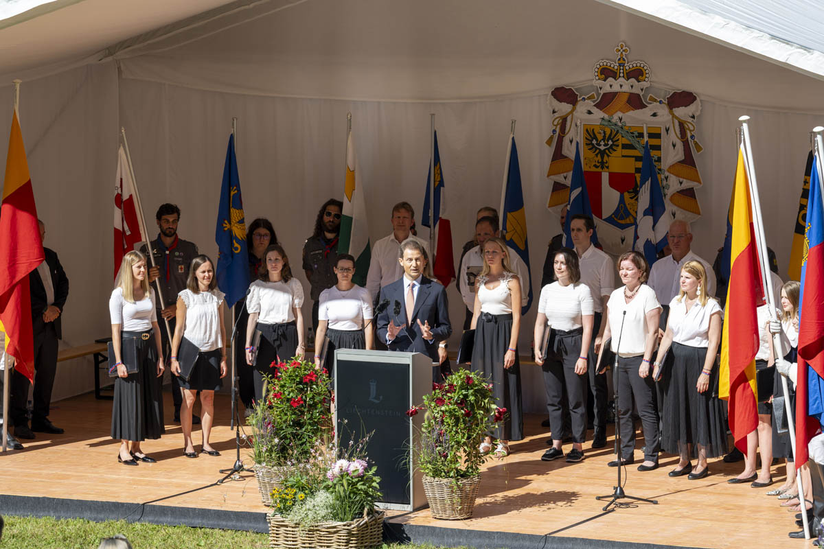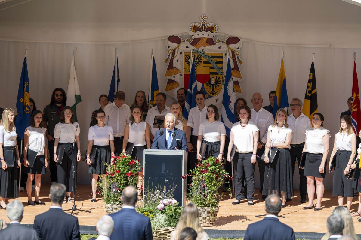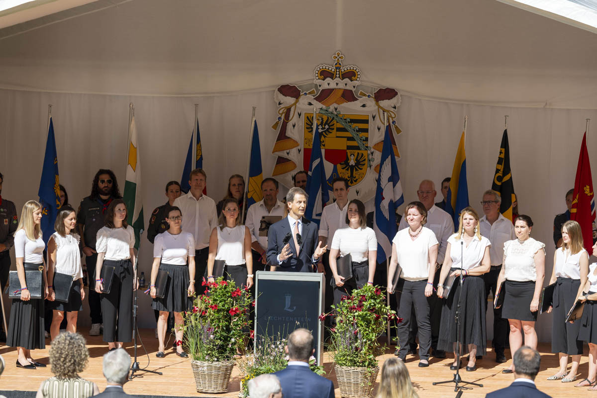 Offizieller Staatsakt mit den Ansprachen von S.D. Erbprinz Alois von und zu Liechtenstein und Landtagspräsident Albert Frick. Feierlich umrahmt von der Harmoniemusik Balzers, zusammen mit einer Formation des Young Unlimited Chors aus Mauren. Die Moderatorin Christiani Wetter führte durch den Staatsakt. Fotos: © exclusiv