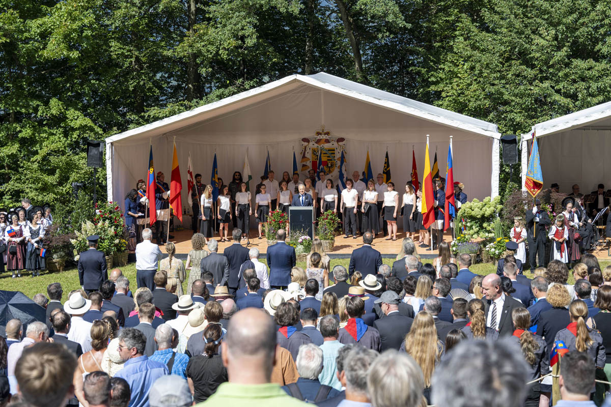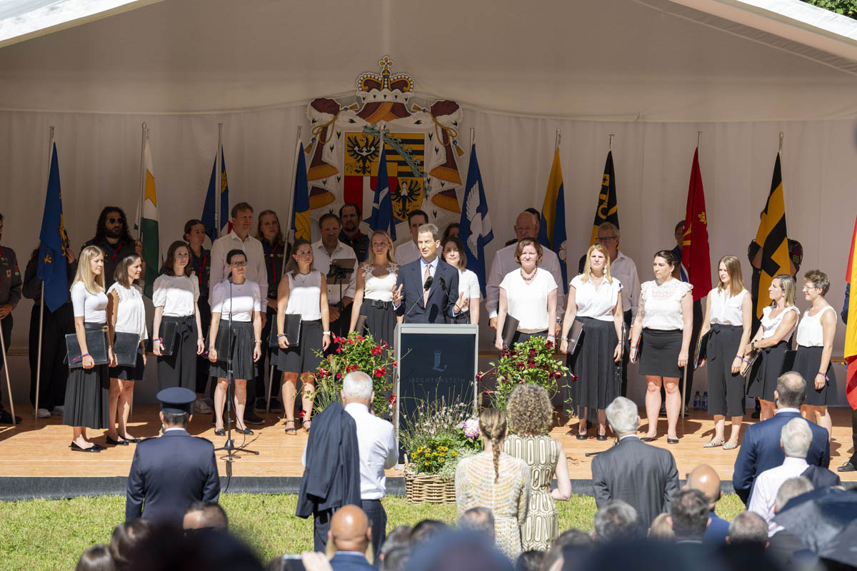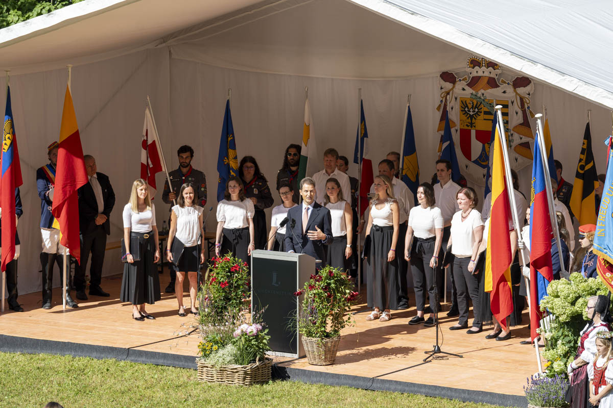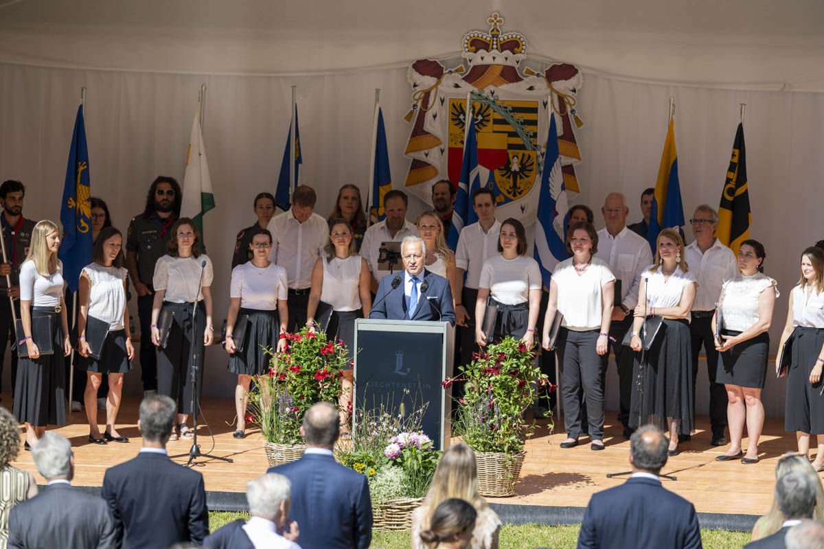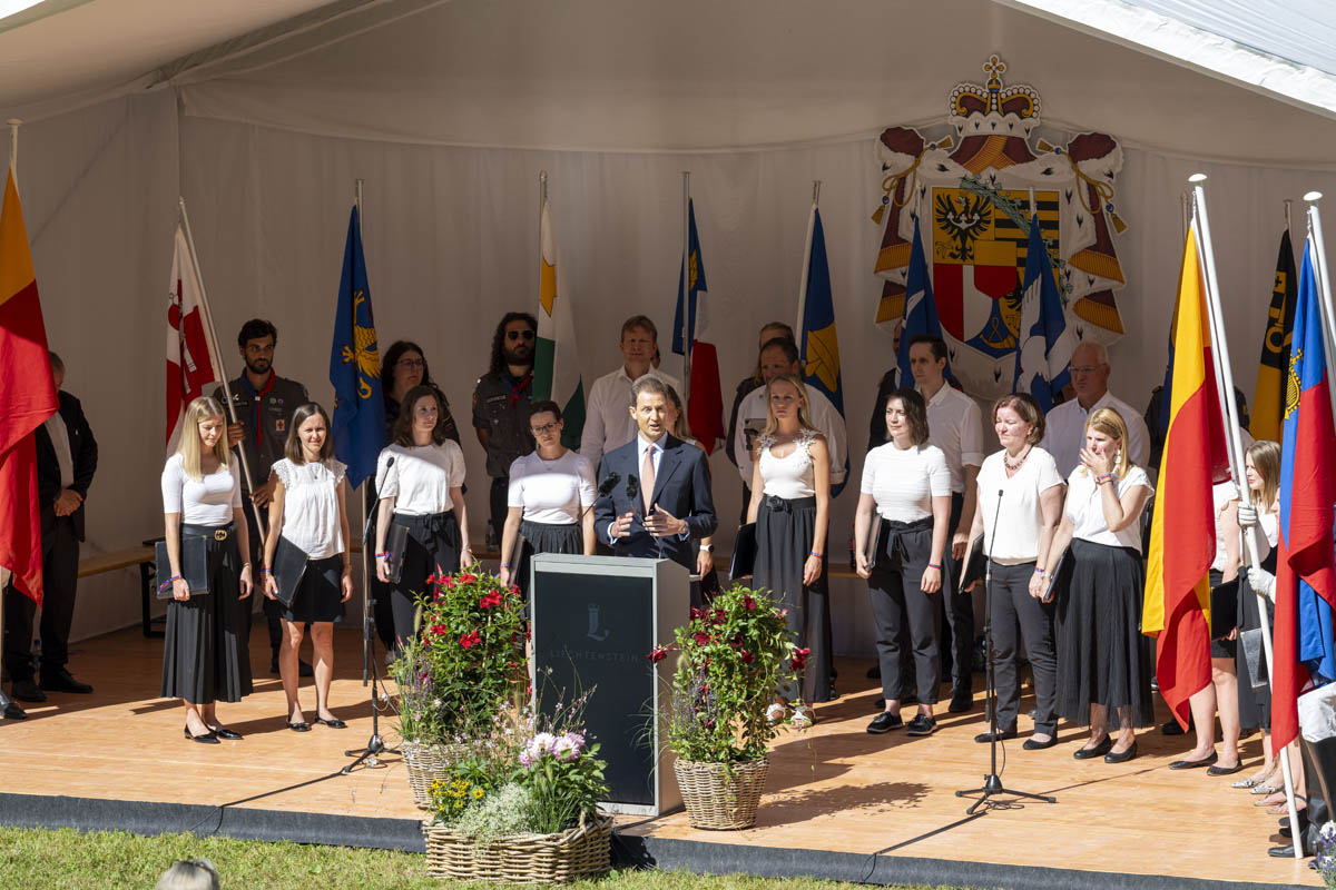Offizieller Staatsakt mit den Ansprachen von S.D. Erbprinz Alois von und zu Liechtenstein und Landtagspräsident Albert Frick. Feierlich umrahmt von der Harmoniemusik Balzers, zusammen mit einer Formation des Young Unlimited Chors aus Mauren. Die Moderatorin Christiani Wetter führte durch den Staatsakt. Fotos: © exclusiv