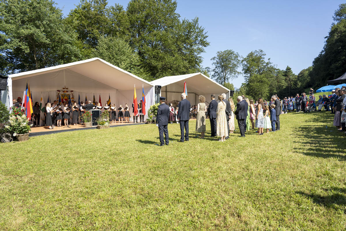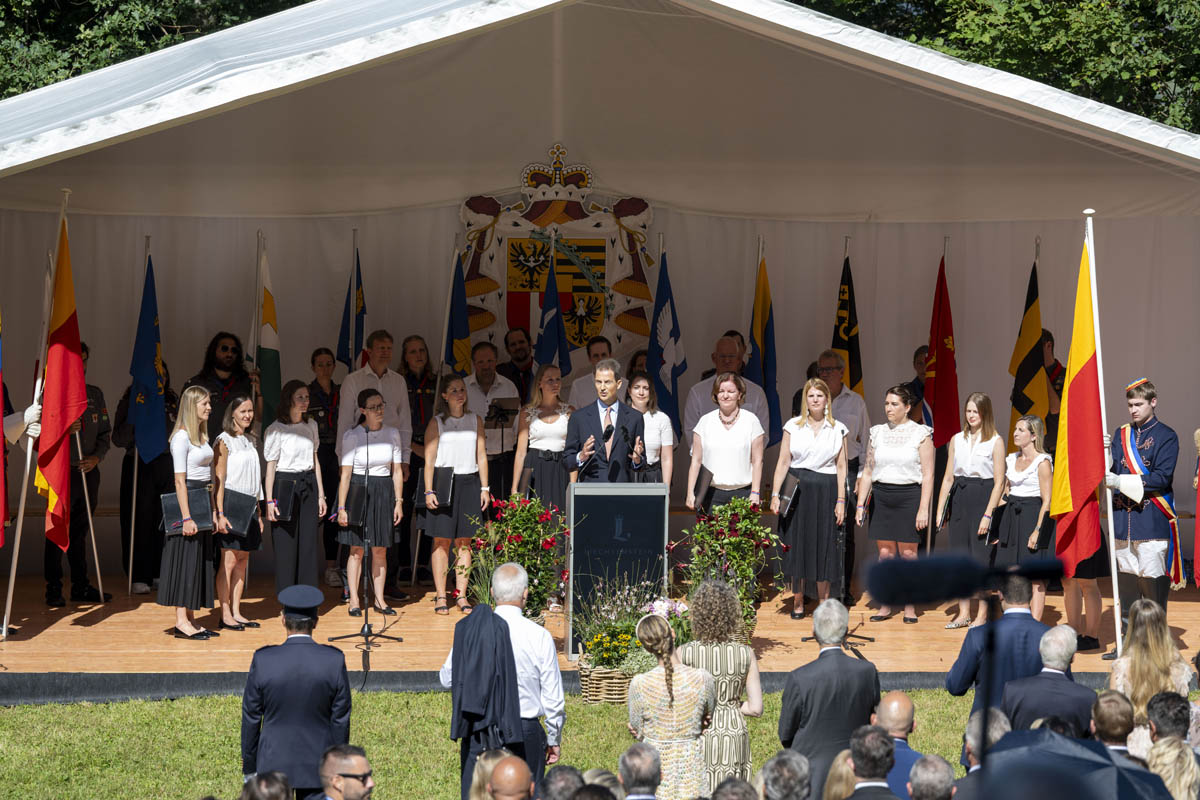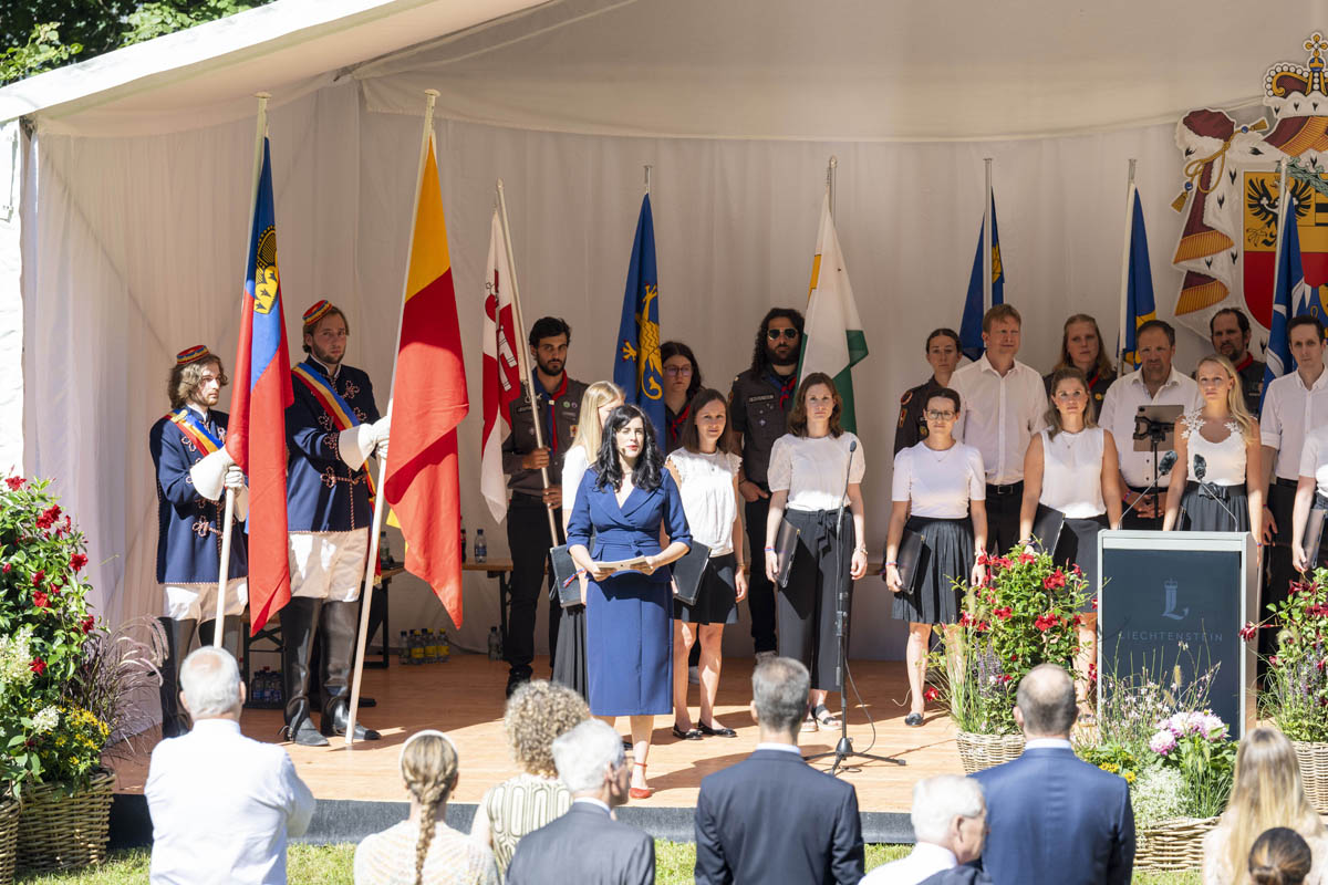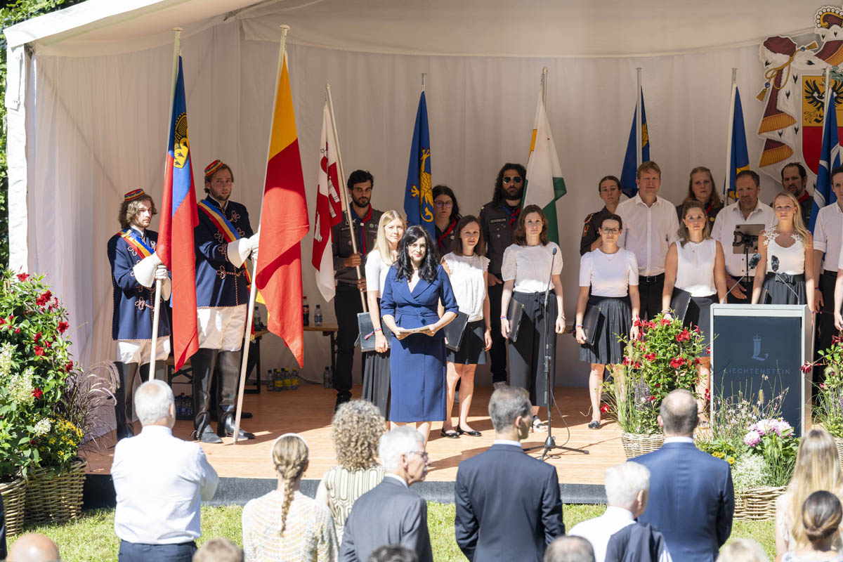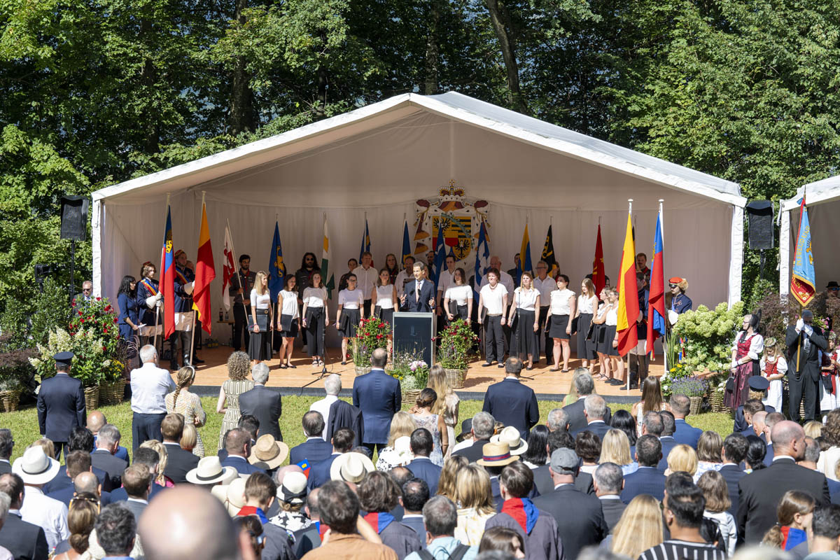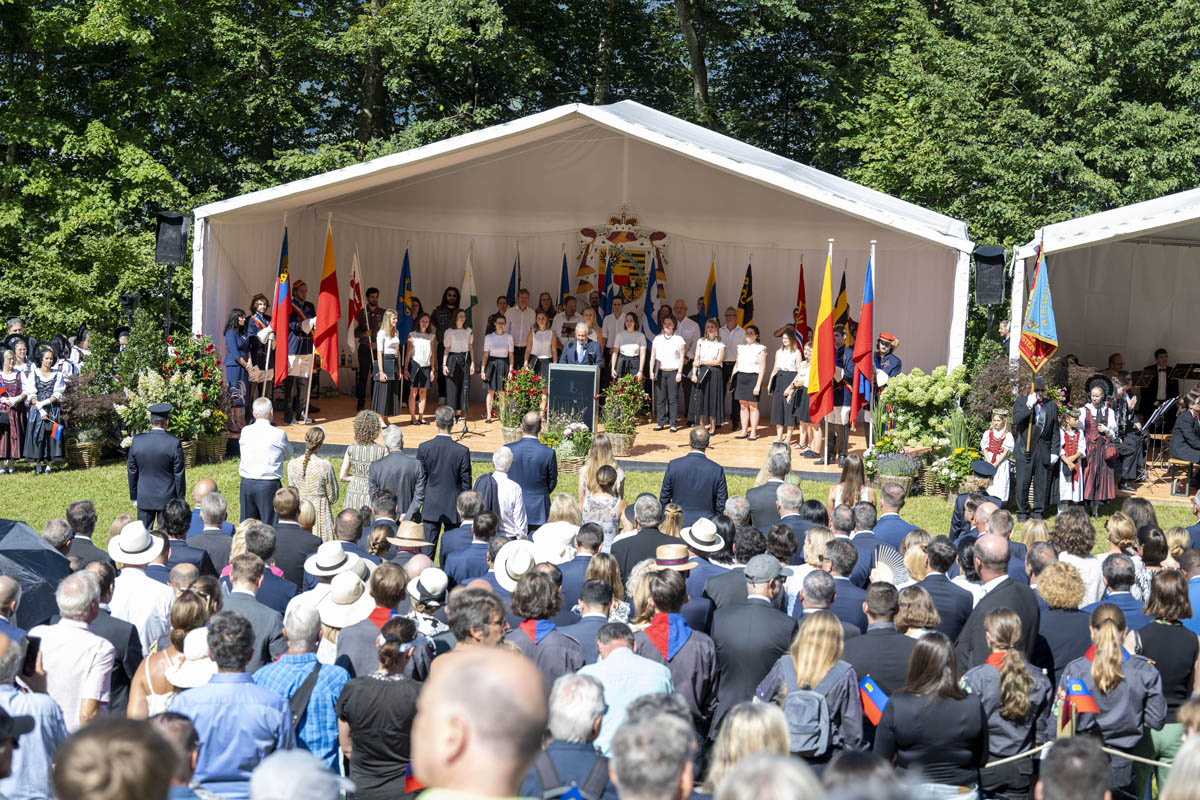 Offizieller Staatsakt mit den Ansprachen von S.D. Erbprinz Alois von und zu Liechtenstein und Landtagspräsident Albert Frick. Feierlich umrahmt von der Harmoniemusik Balzers, zusammen mit einer Formation des Young Unlimited Chors aus Mauren. Die Moderatorin Christiani Wetter führte durch den Staatsakt. Fotos: © exclusiv