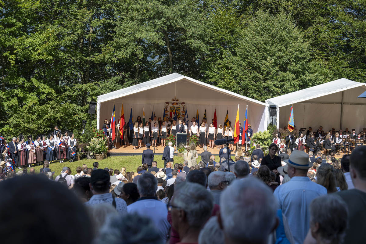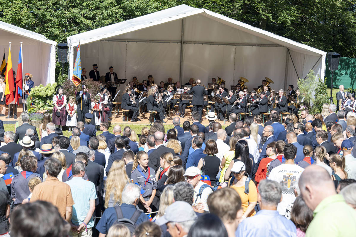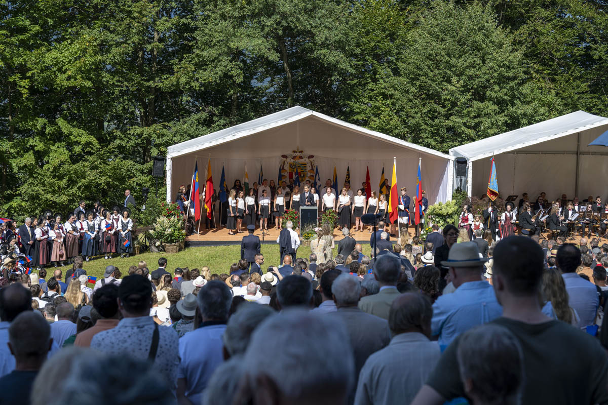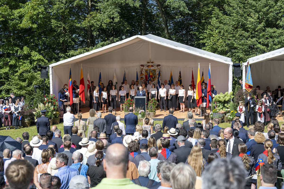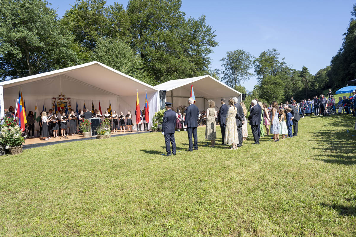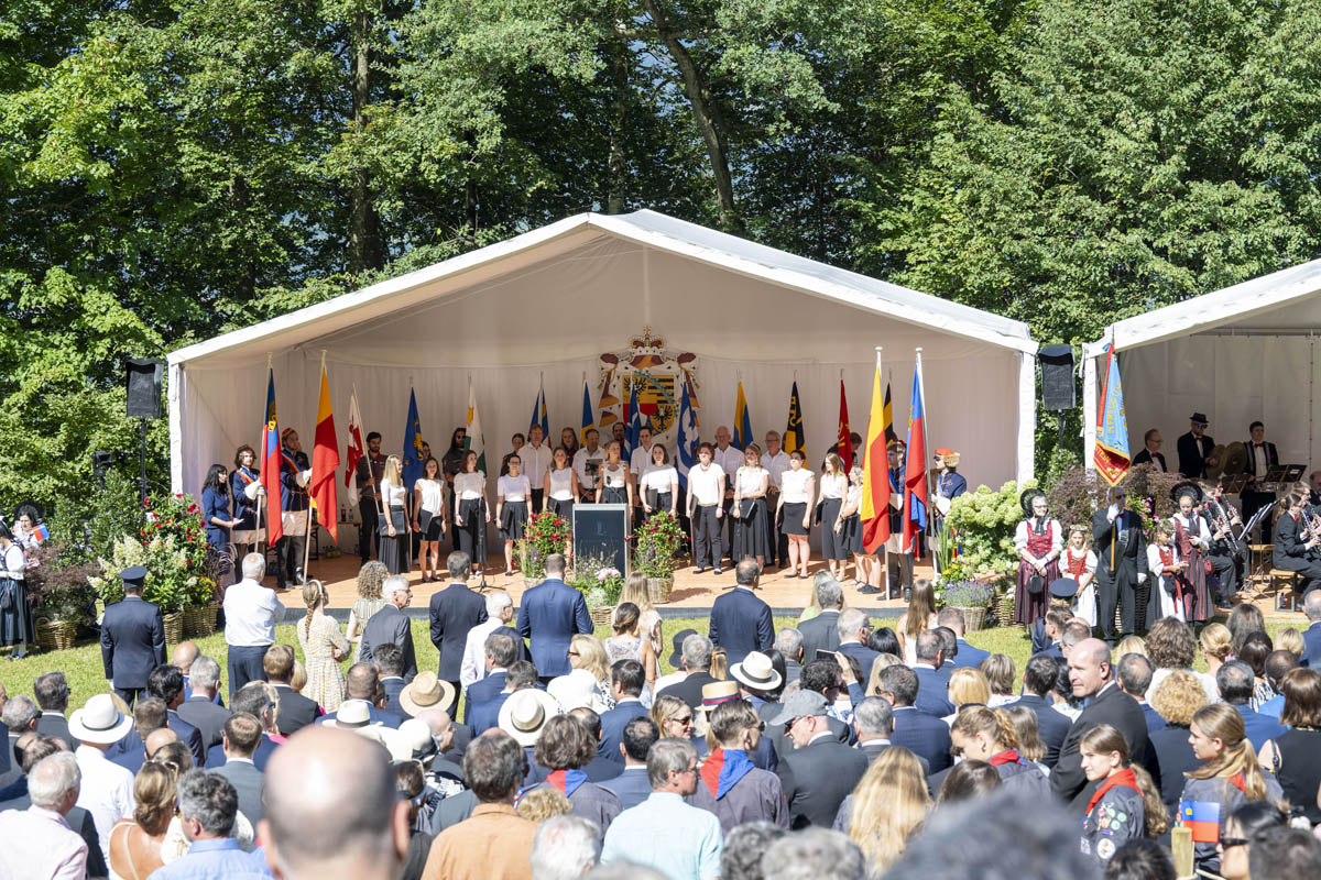Offizieller Staatsakt mit den Ansprachen von S.D. Erbprinz Alois von und zu Liechtenstein und Landtagspräsident Albert Frick. Feierlich umrahmt von der Harmoniemusik Balzers, zusammen mit einer Formation des Young Unlimited Chors aus Mauren. Die Moderatorin Christiani Wetter führte durch den Staatsakt. Fotos: © exclusiv