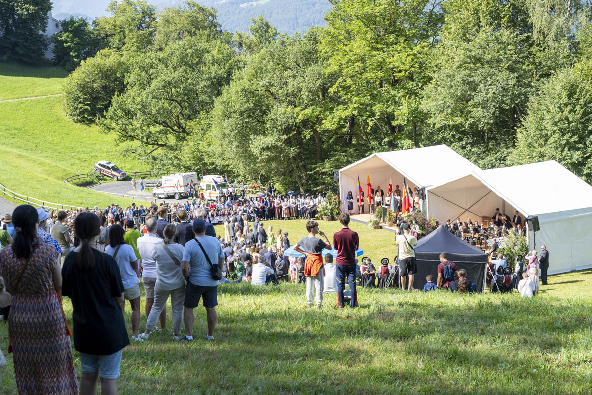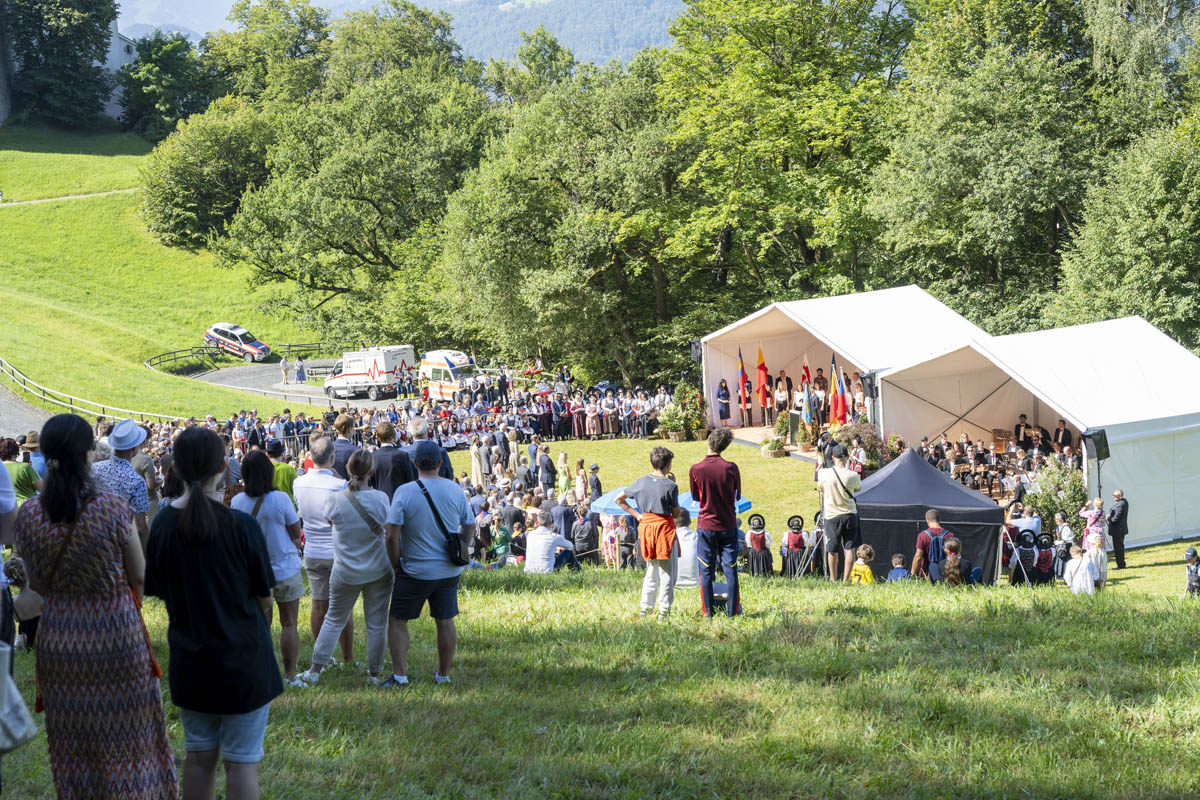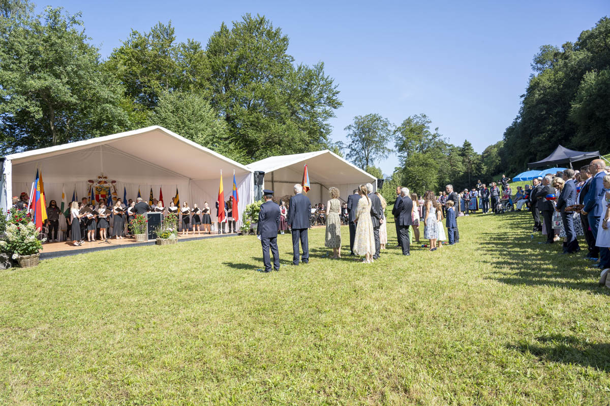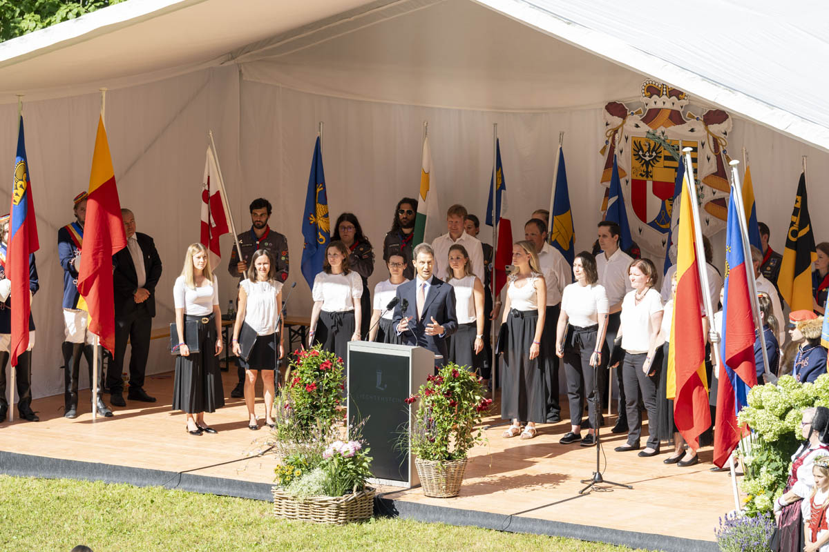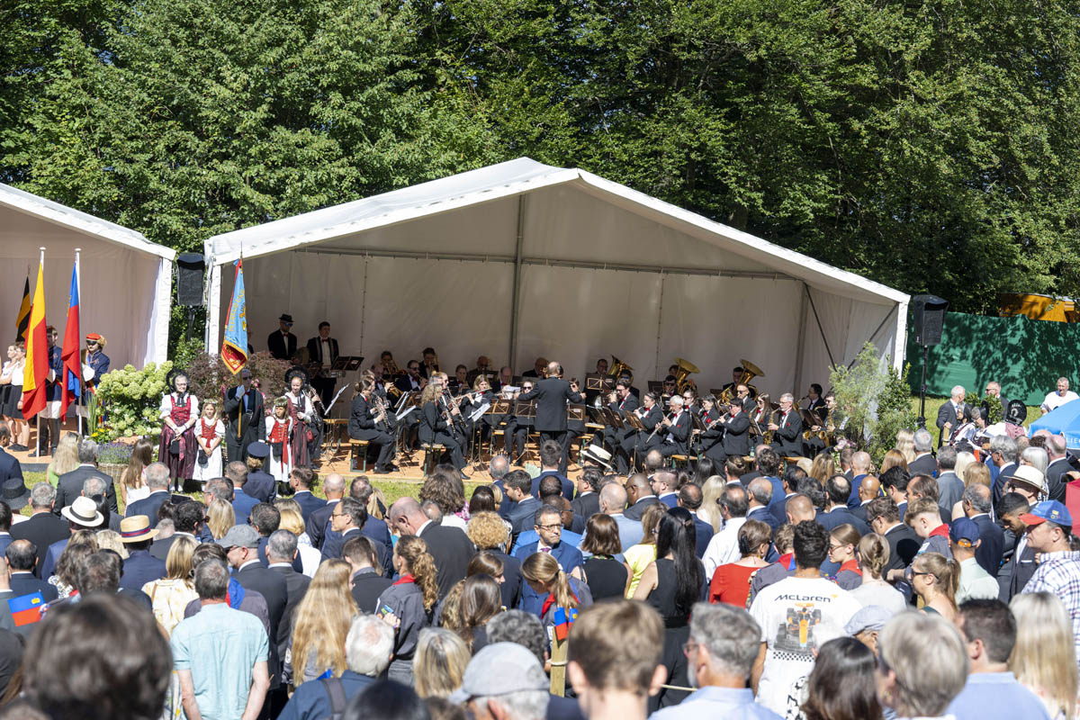 Offizieller Staatsakt mit den Ansprachen von S.D. Erbprinz Alois von und zu Liechtenstein und Landtagspräsident Albert Frick. Feierlich umrahmt von der Harmoniemusik Balzers, zusammen mit einer Formation des Young Unlimited Chors aus Mauren. Die Moderatorin Christiani Wetter führte durch den Staatsakt. Fotos: © exclusiv
