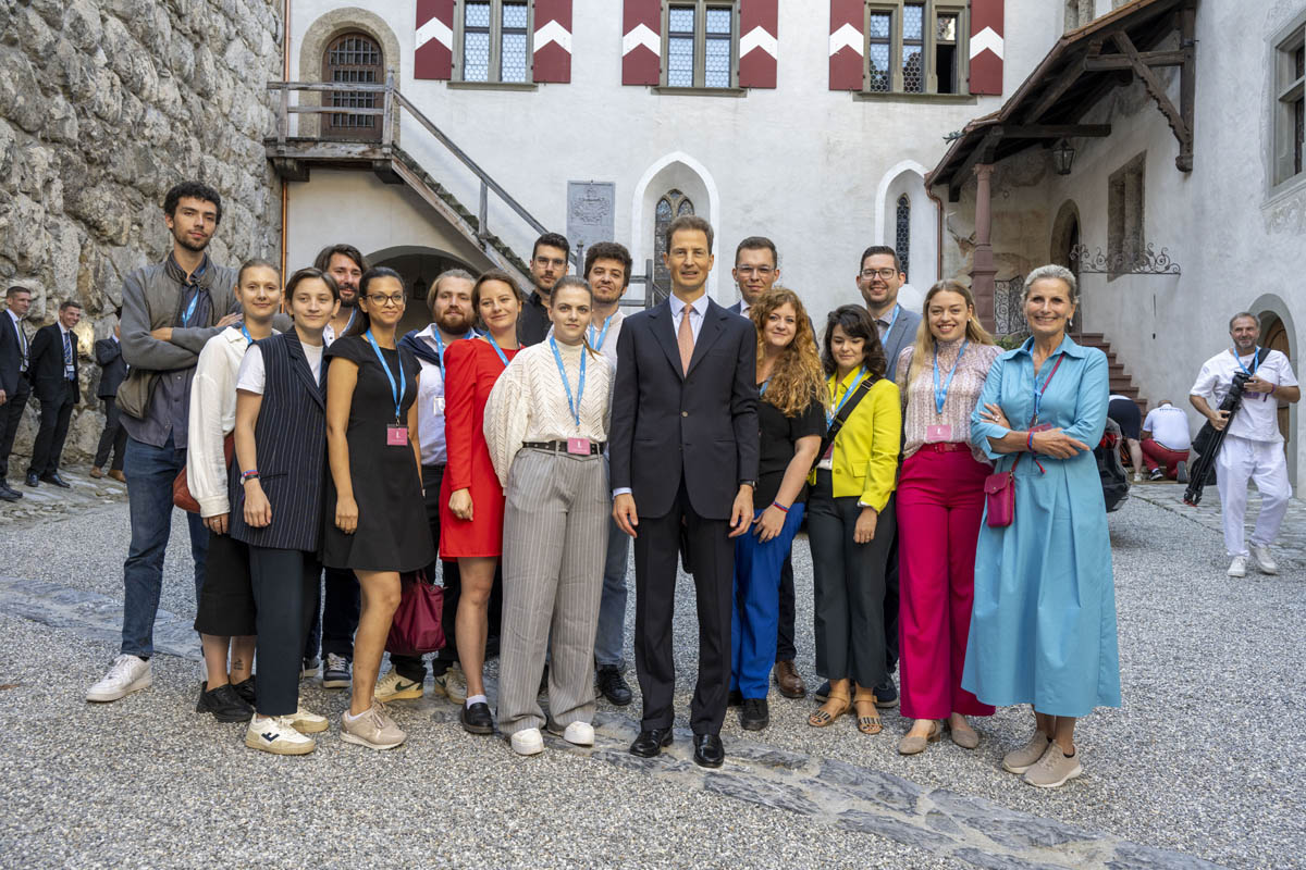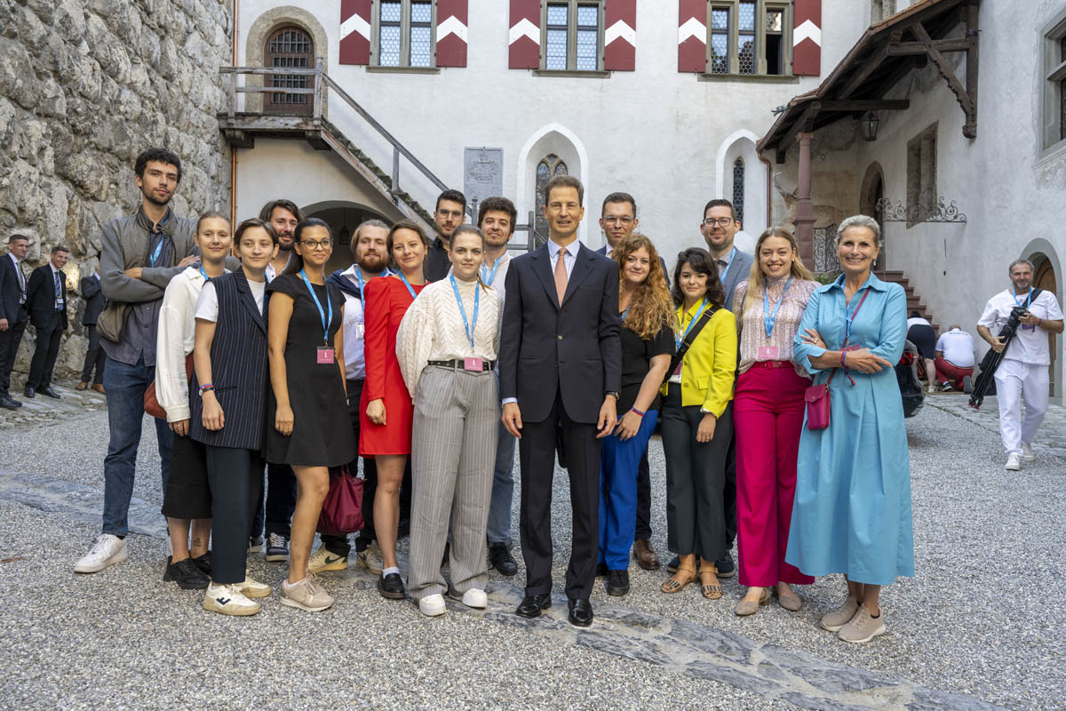 Zehn Studierende der Internationalen Medienakademie an der Universität Liechtenstein kamen am Staatsfeiertag mit ihrer Lehrgangsleiterin Claudia Schanza und Absolventen der vergangenen Jahre zum Fürstenfest. Im Schlosshof beobachteten sie Medienprofis bei der Arbeit. Das Gruppenfoto mit Erbprinz Alois von und zu Liechtenstein wird sie an einen Höhepunkt des vierwöchigen Lehrgangs erinnern. Danach wohnten sie dem Staatsakt auf der Schlosswiese bei und verfassten zu Übungszwecken Kurzmeldungen, die sie direkt nach den Reden zum Feedback an ihre Dozentin abgaben. Diese Ausbildung findet seit 2010 jährlich statt und ist sehr praxisnah. Junge Talente aus Deutschland, Österreich, Südtirol, der Schweiz und Spanien nehmen in diesem Jahr teil. Die Begegnung mit Alumni ist für sie motivierend, denn viele von ihnen haben mittlerweile Karriere gemacht und arbeiten etwa bei NZZ, Keystone-sda, Vaterland und anderen Medien. Medienakademie.li