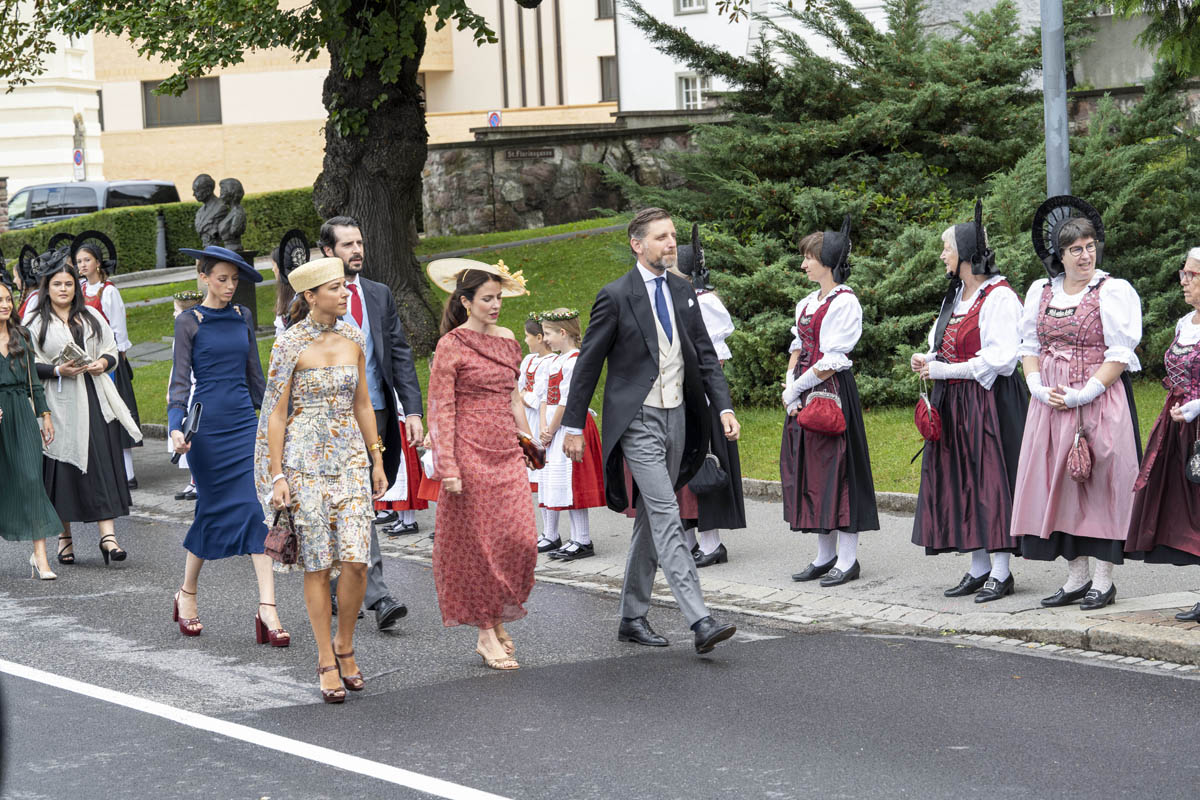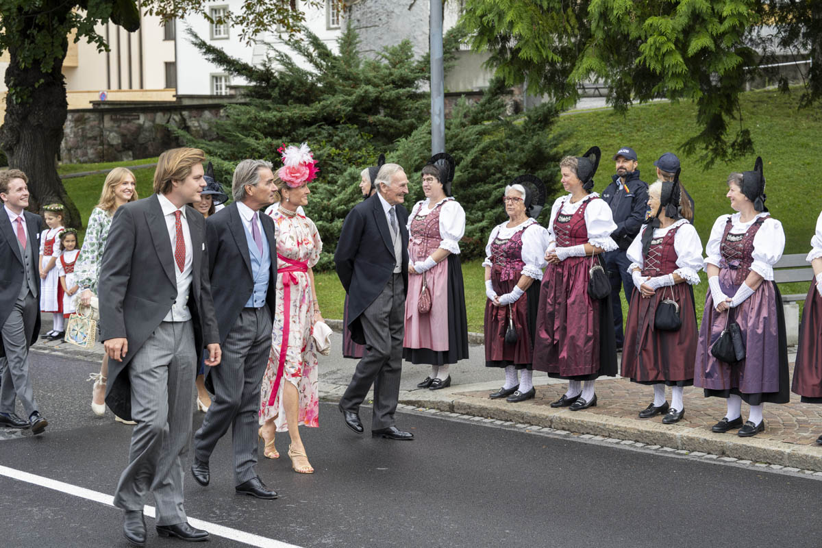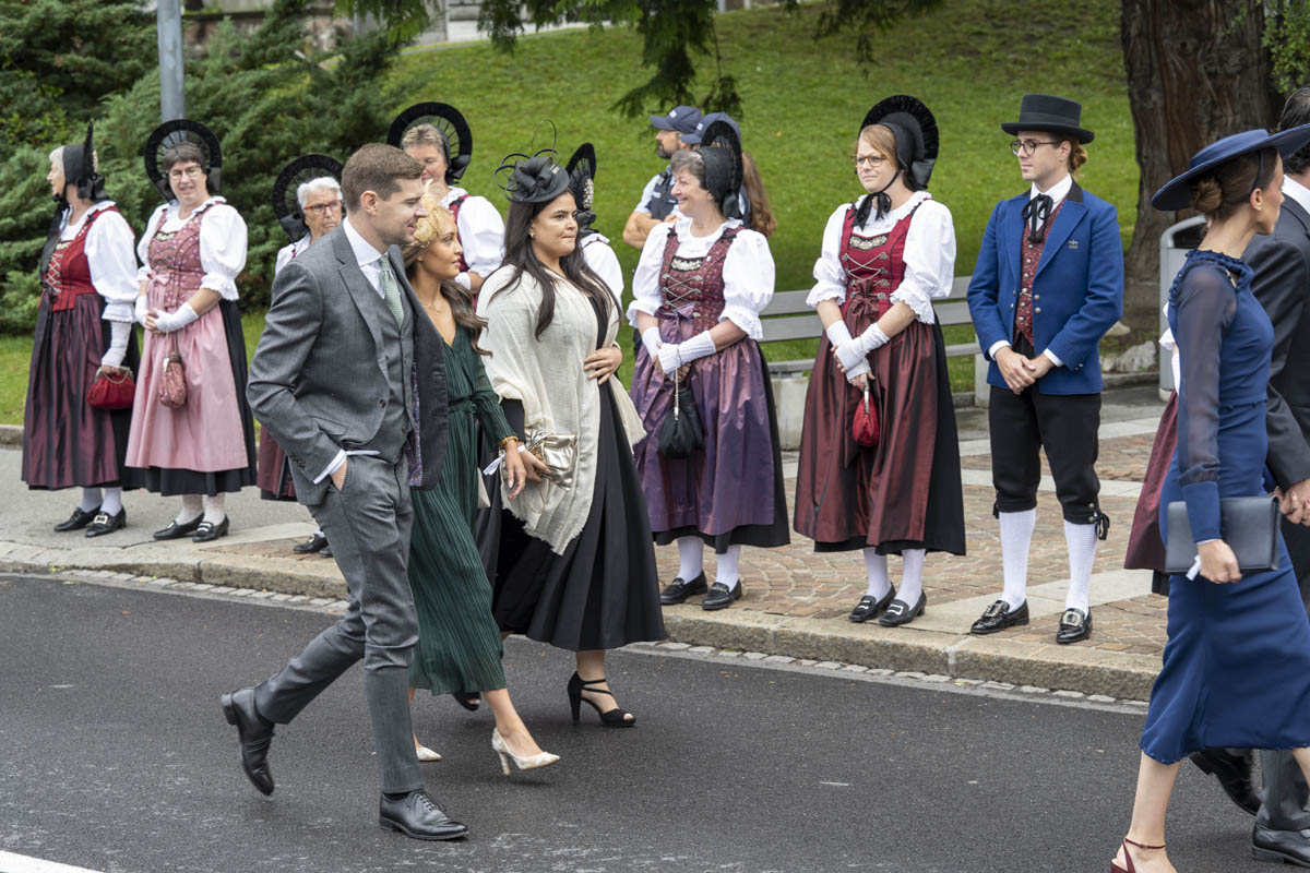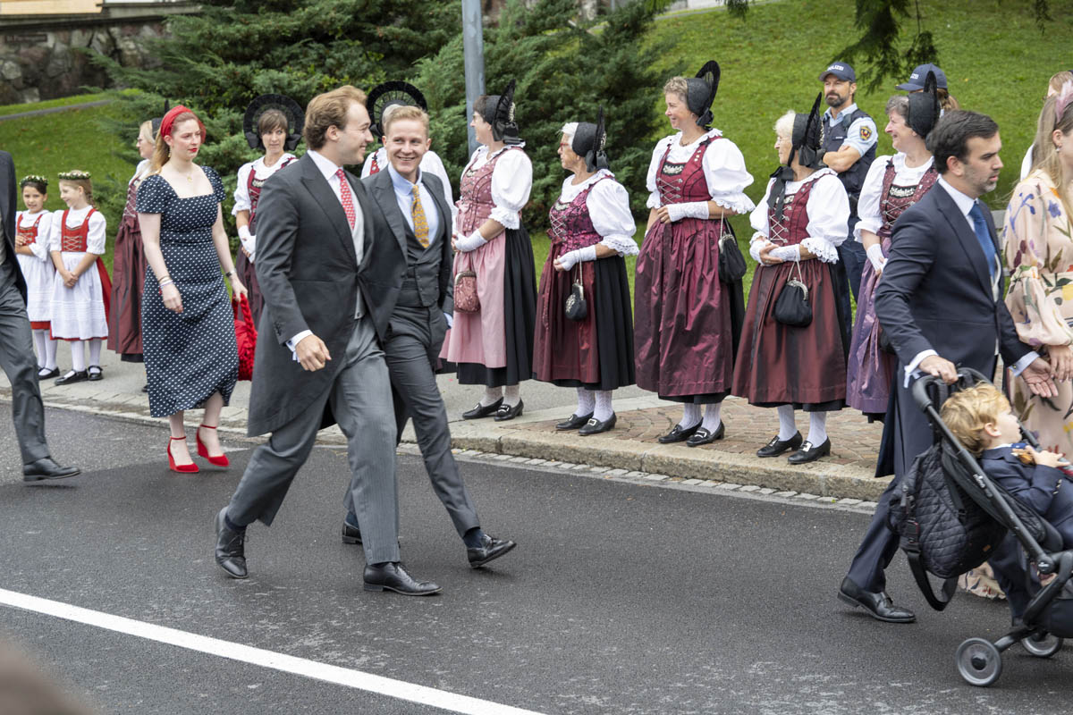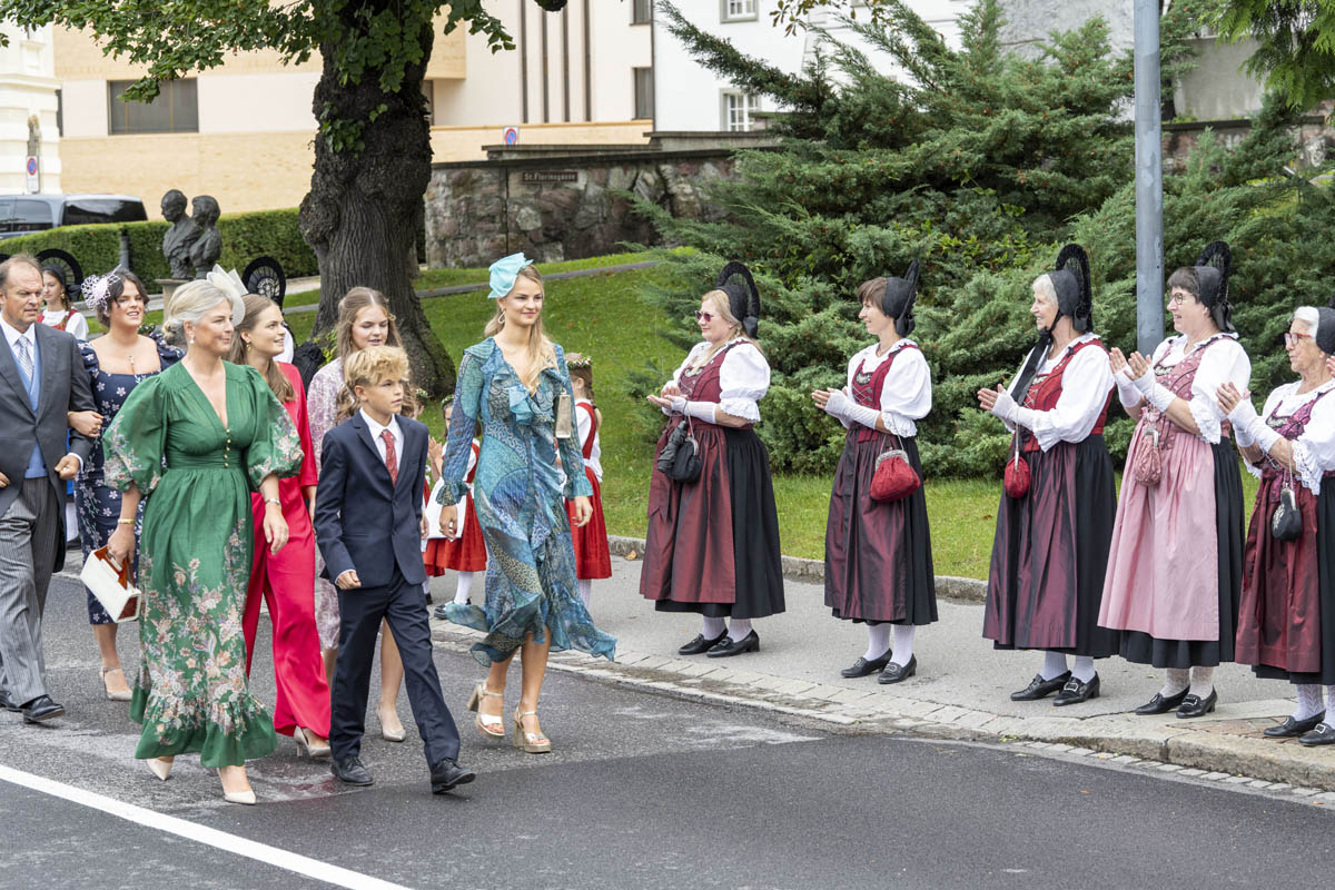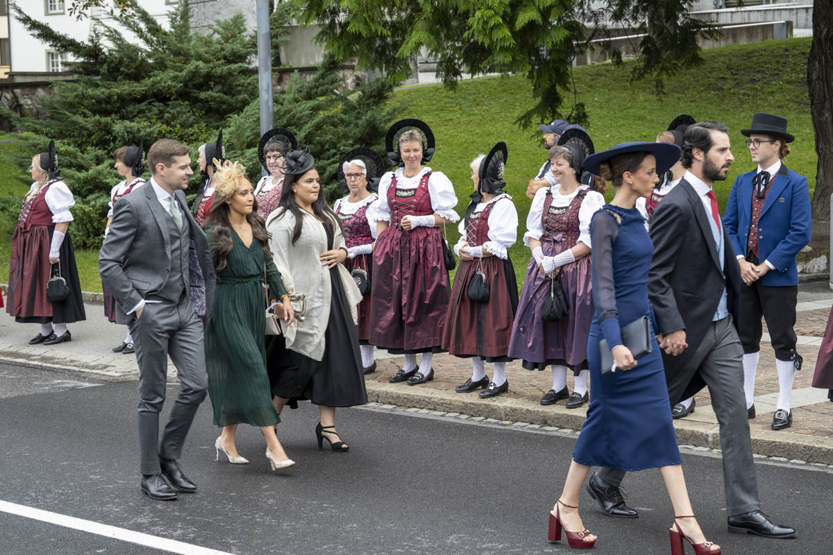 30. August 2025 – Die Hochzeitsfeierlichkeiten begannen am Vormittag mit der feierlichen Ankunft der Gäste an der Kathedrale St. Florin in Vaduz. Pfadfinderinnen und Pfadfinder unterstützten die Gäste beim Eintreffen, während Trachtenfrauen, -mädchen und -jungen Spalier standen.