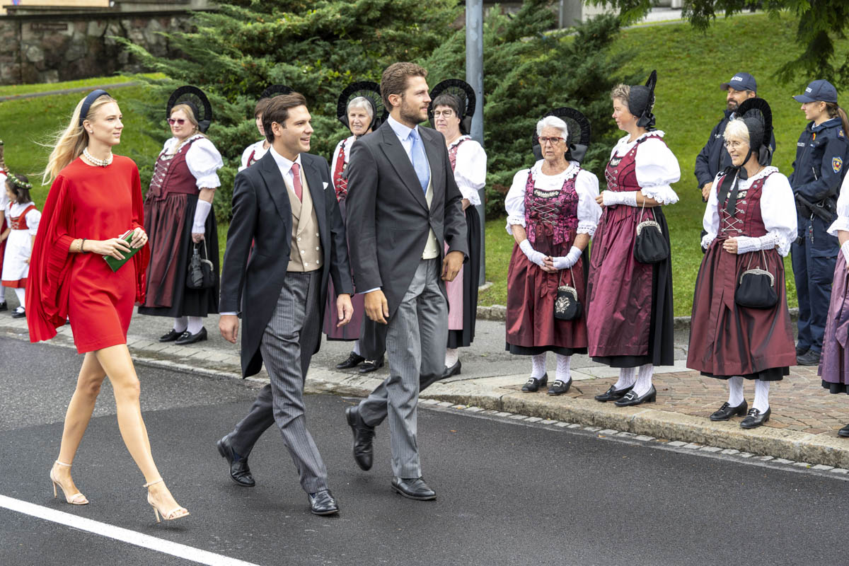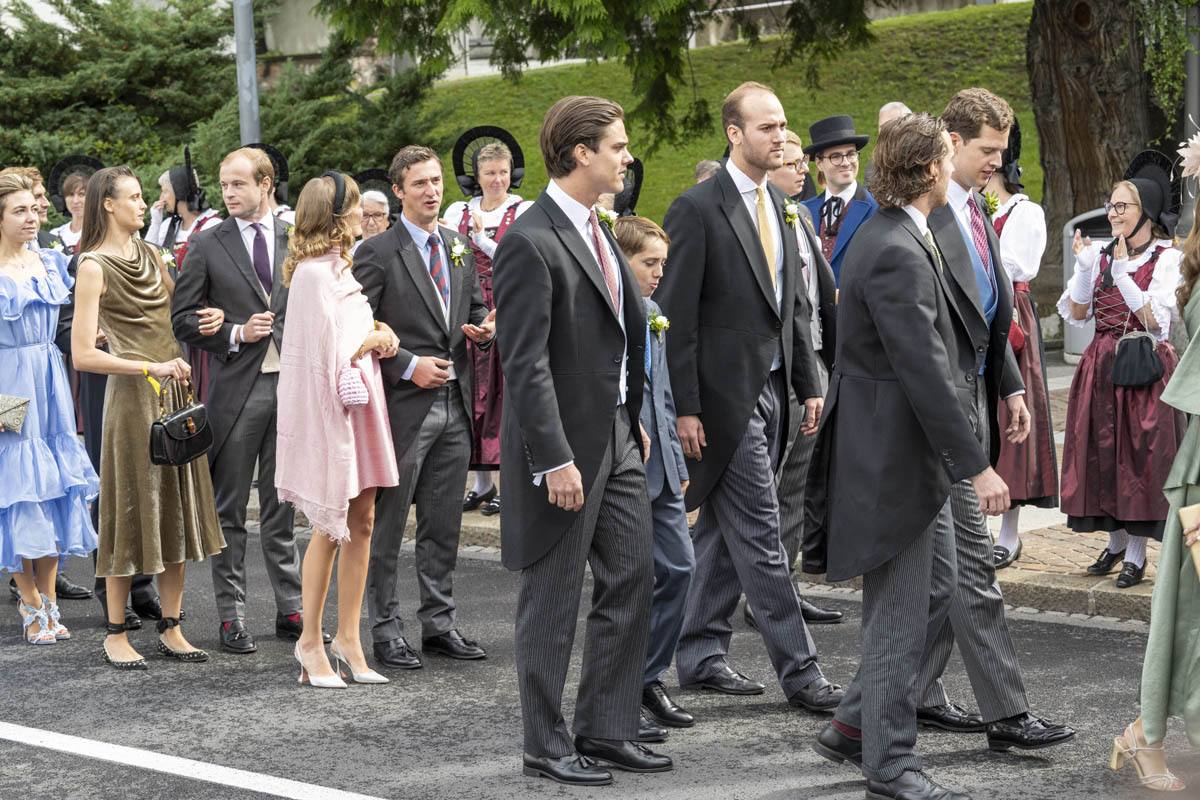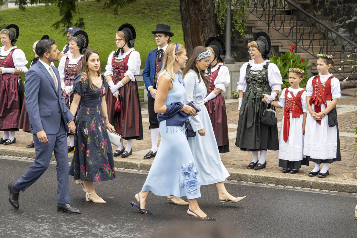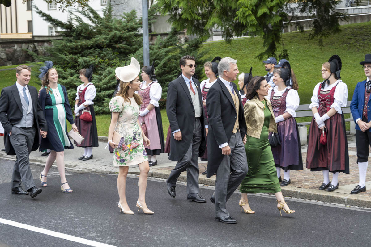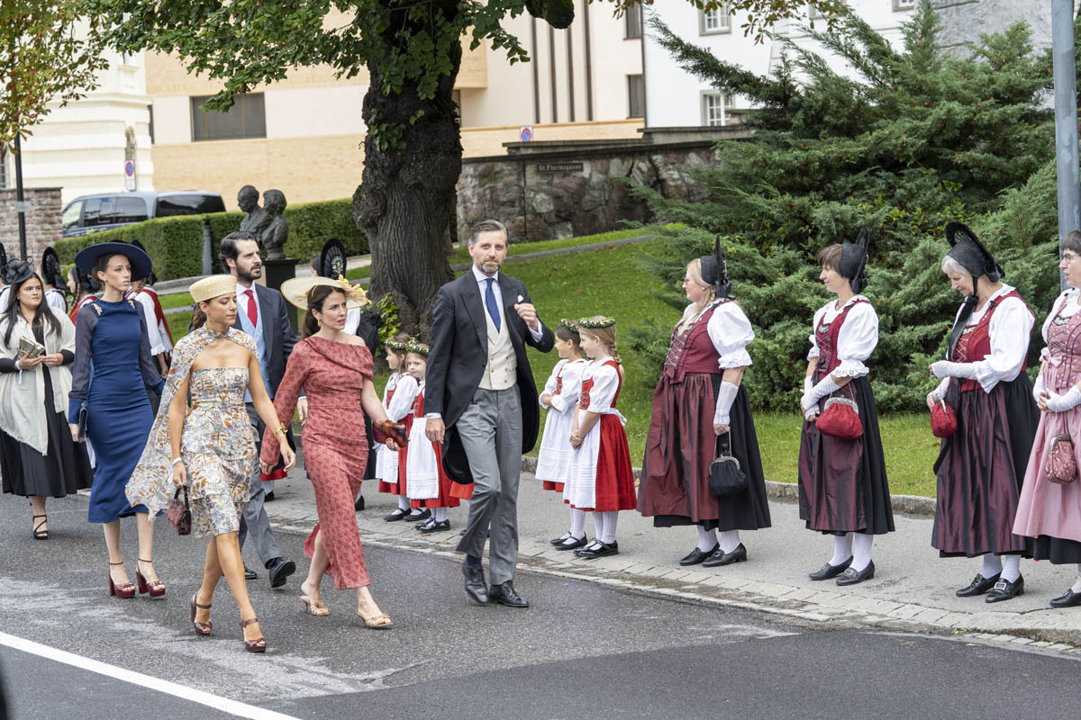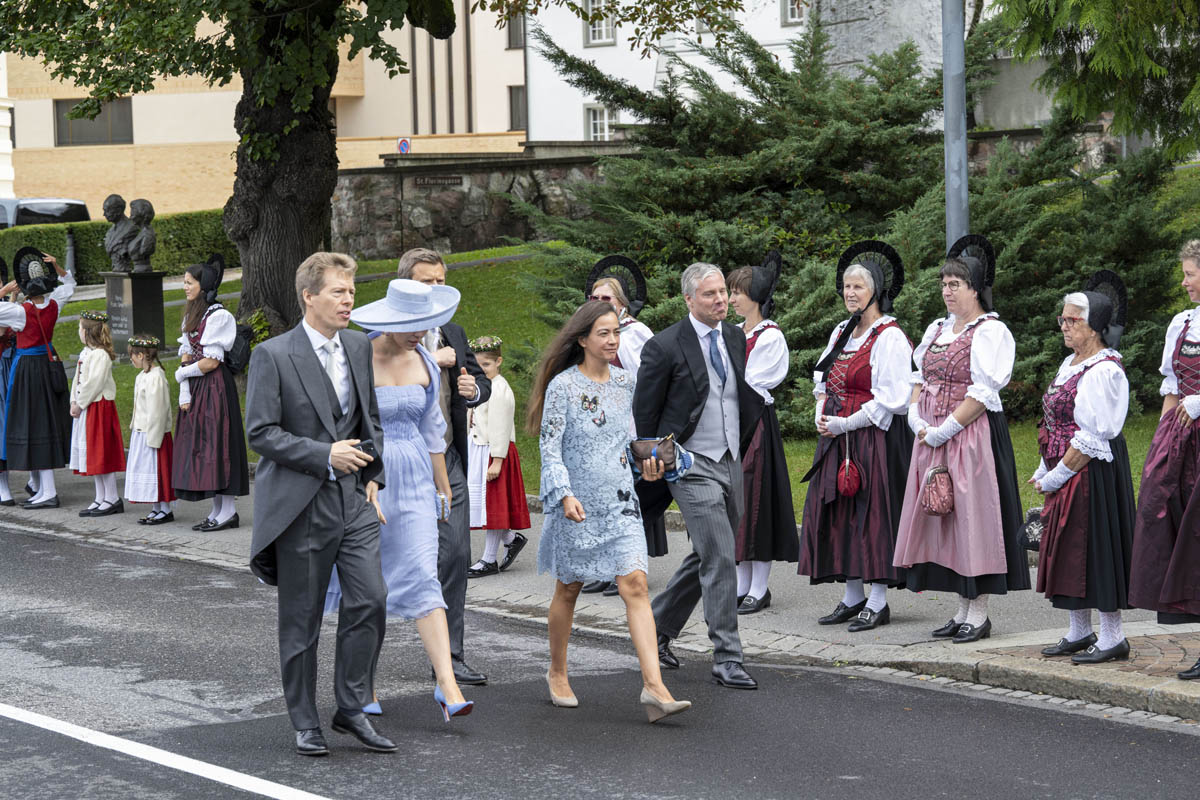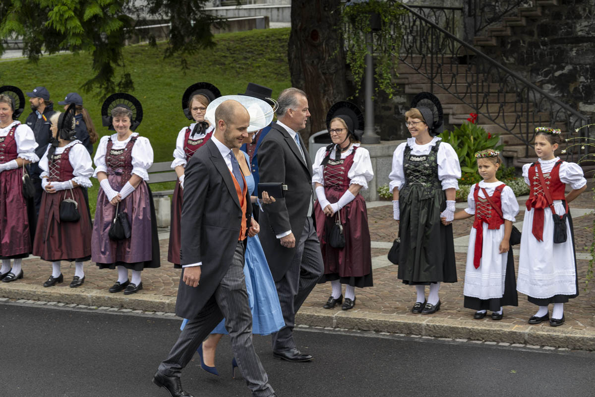 30. August 2025 – Die Hochzeitsfeierlichkeiten begannen am Vormittag mit der feierlichen Ankunft der Gäste an der Kathedrale St. Florin in Vaduz. Pfadfinderinnen und Pfadfinder unterstützten die Gäste beim Eintreffen, während Trachtenfrauen, -mädchen und -jungen Spalier standen.