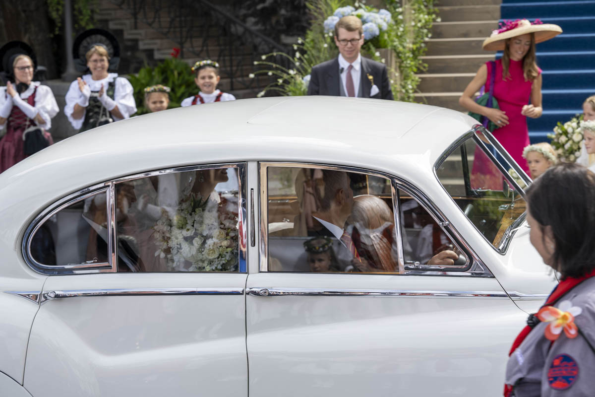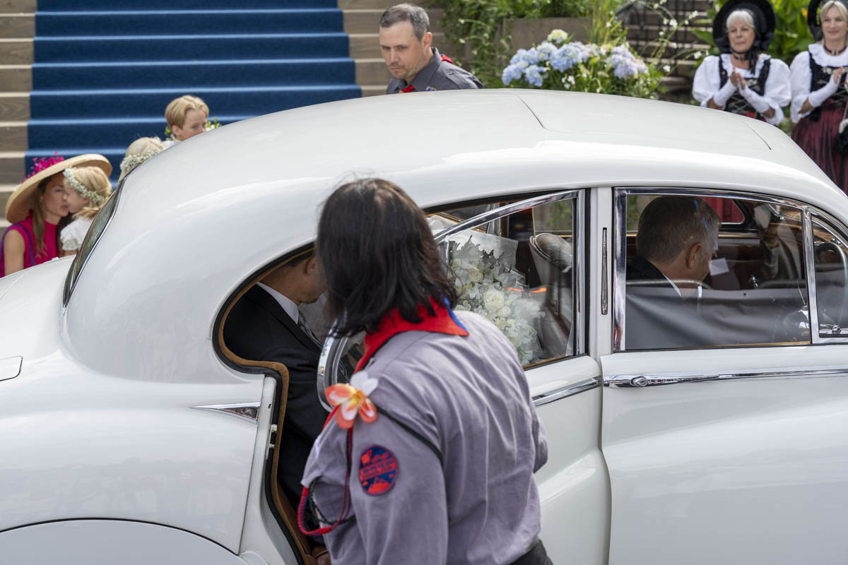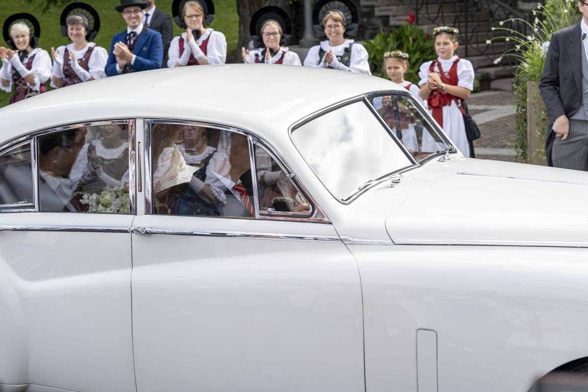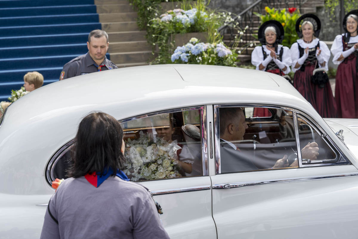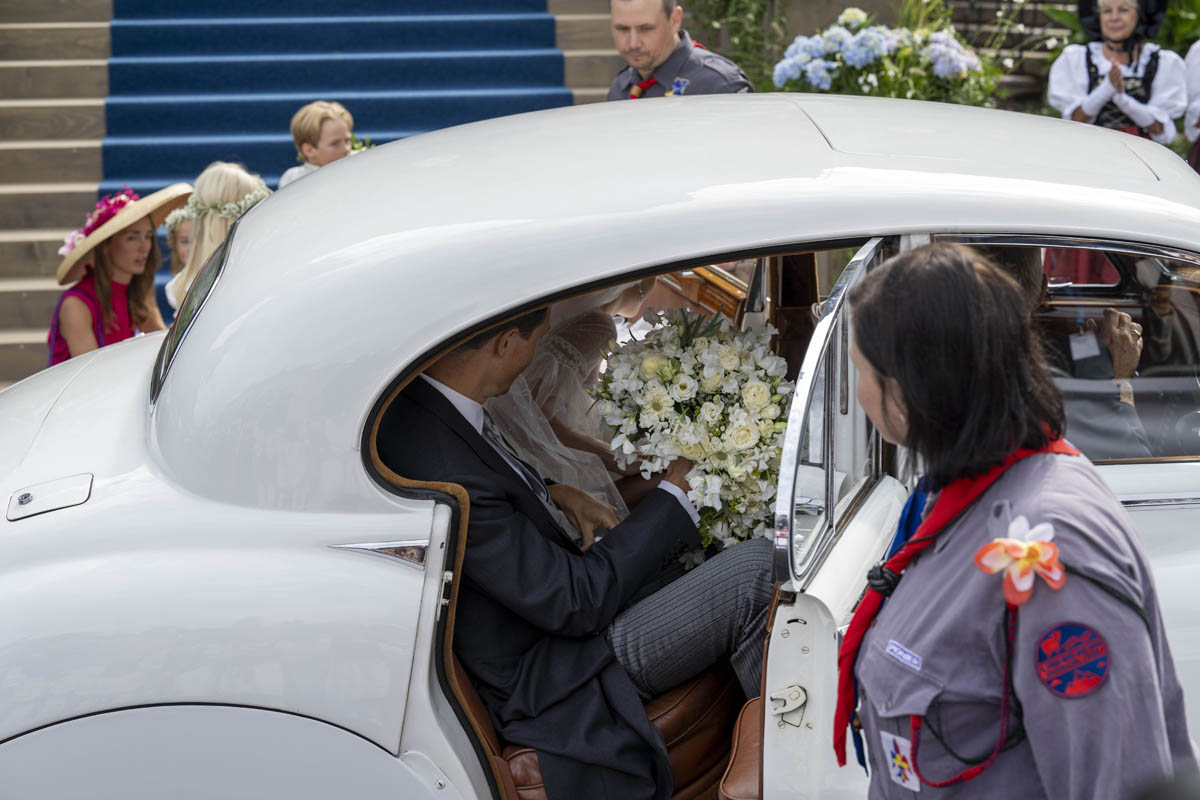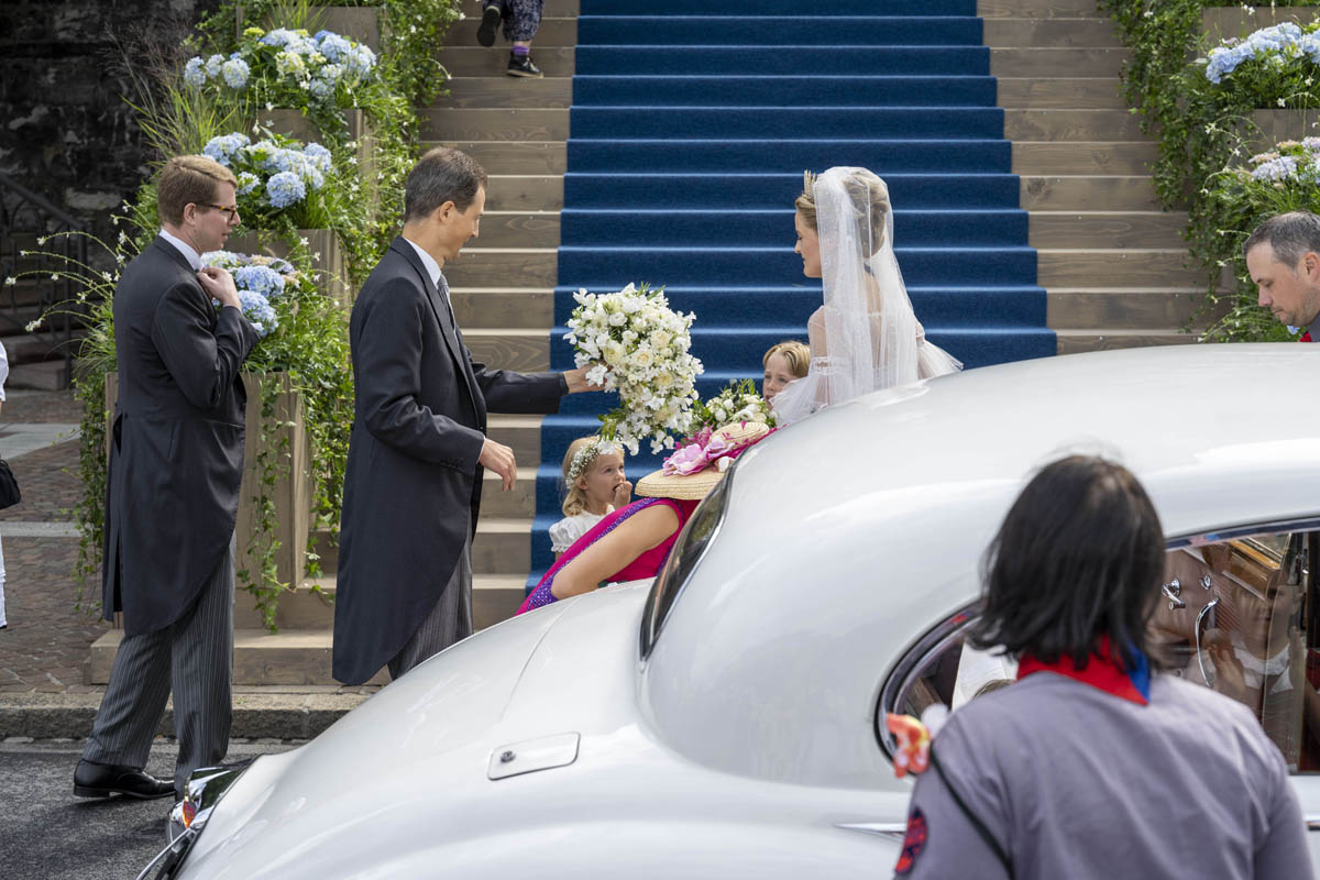Die Braut I.D. Prinzessin Marie Caroline von und zu Liechtenstein traf feierlich mit einem Oldtimer an der Kathedrale St. Florin in Vaduz ein. Begleitet von ihrem Vater, S.D. Erbprinz Alois von und zu Liechtenstein, führte ihr Weg zum Altar – ein berührender Moment für Familie, Freunde und Gäste.