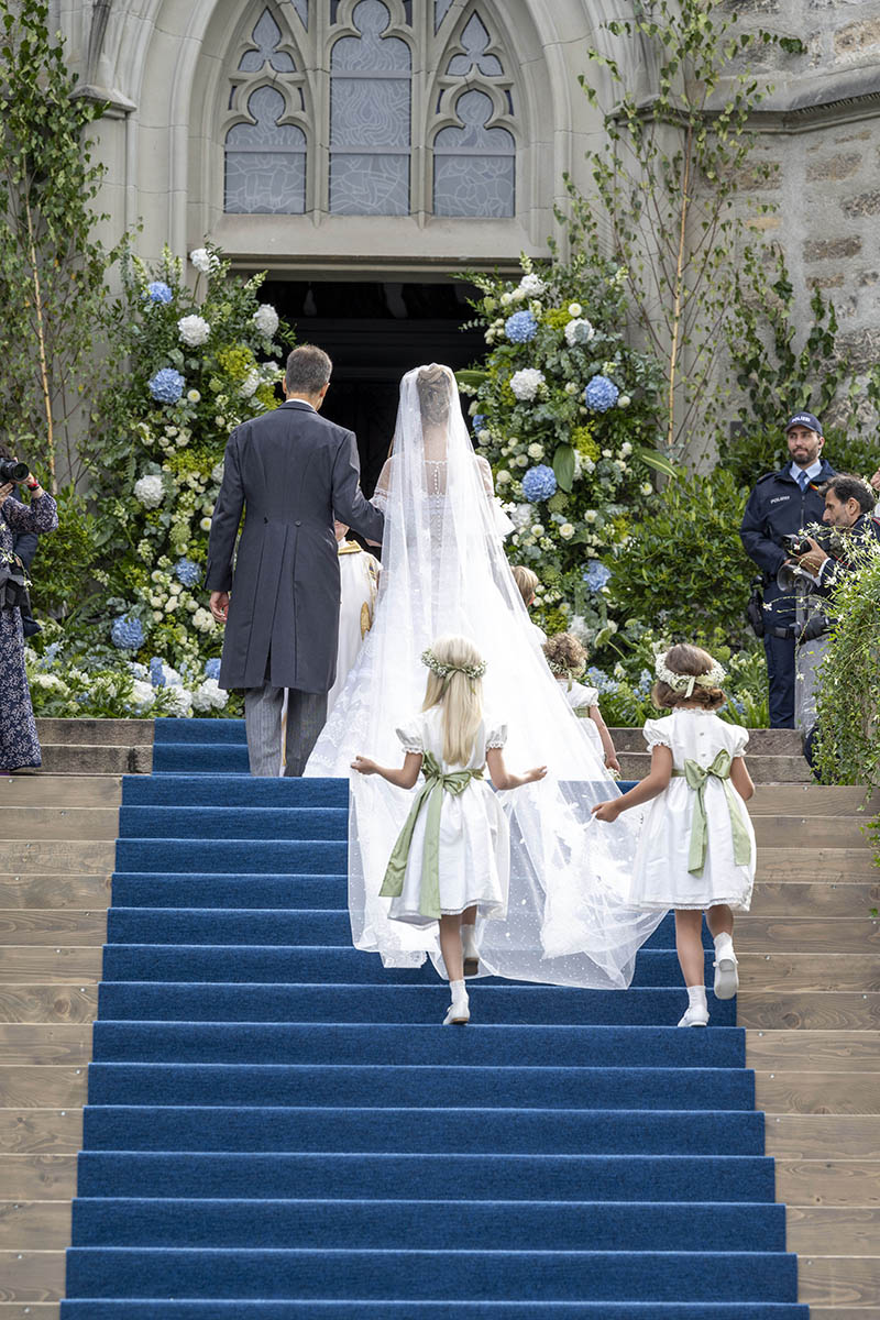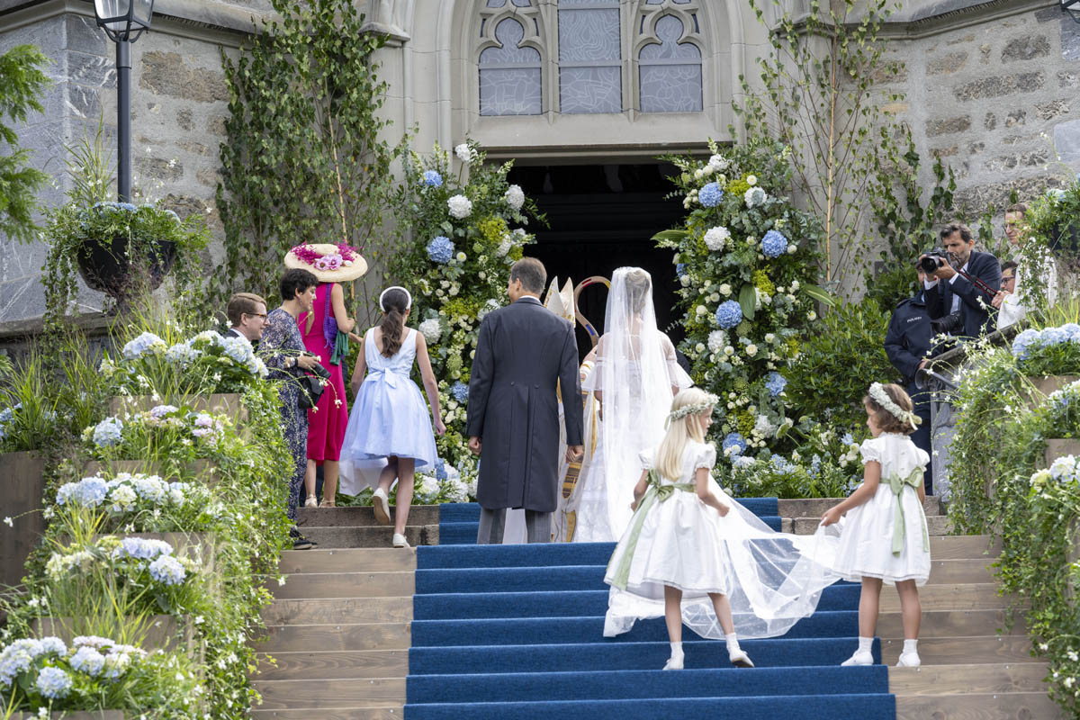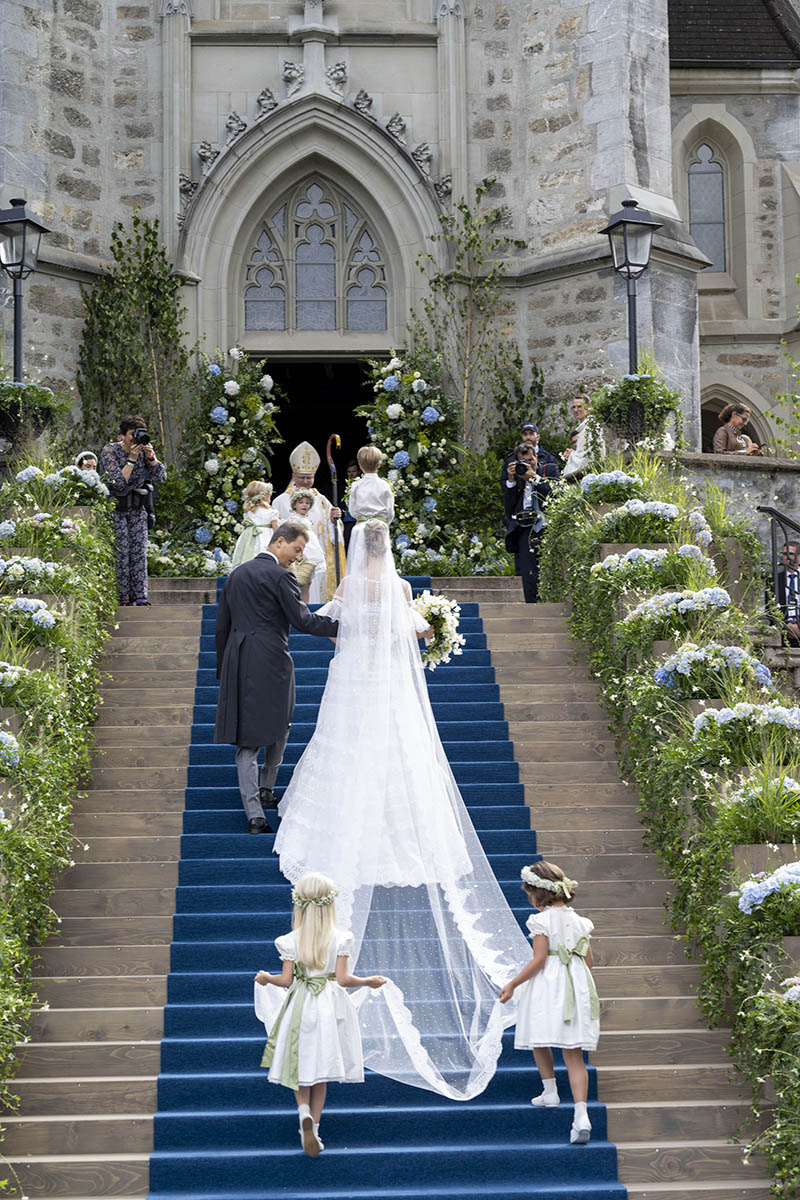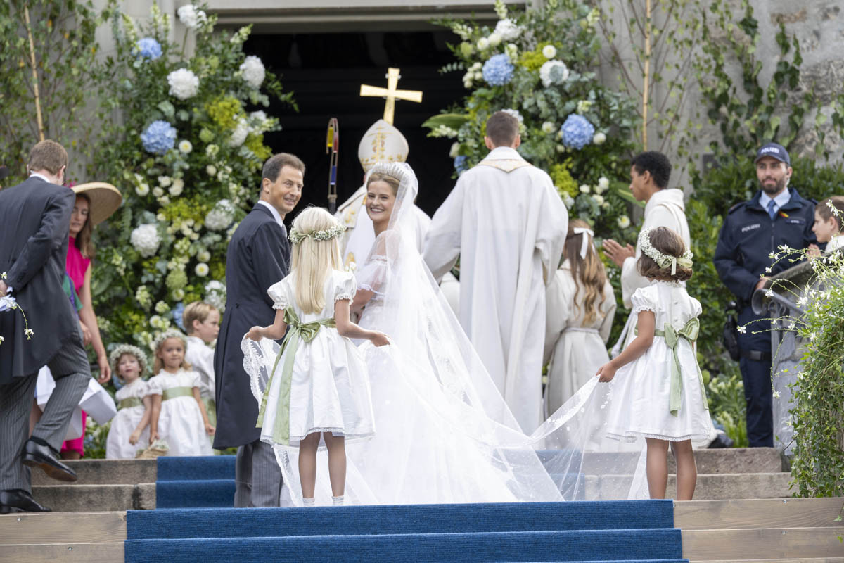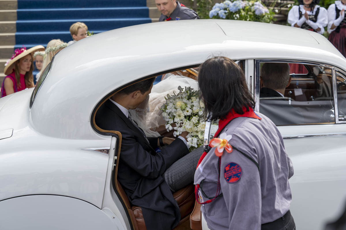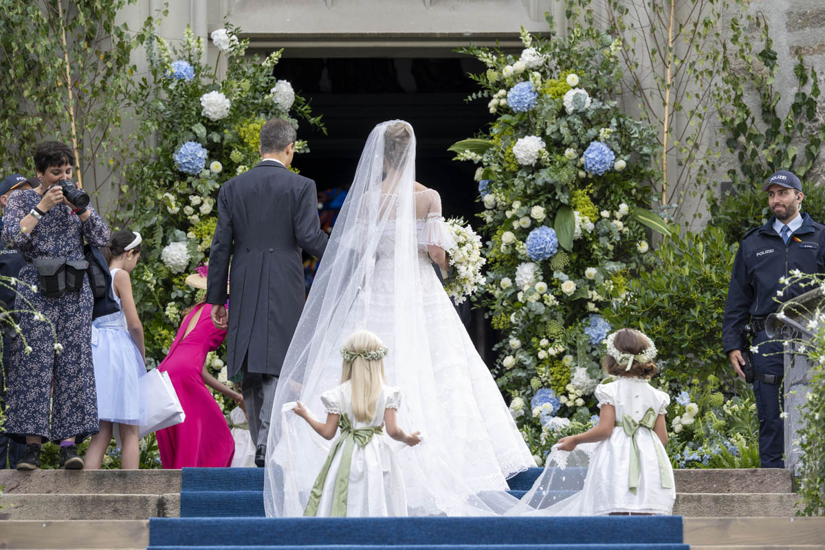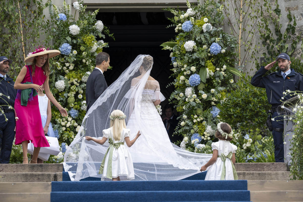 Die Braut I.D. Prinzessin Marie Caroline von und zu Liechtenstein traf feierlich mit einem Oldtimer an der Kathedrale St. Florin in Vaduz ein. Begleitet von ihrem Vater, S.D. Erbprinz Alois von und zu Liechtenstein, führte ihr Weg zum Altar – ein berührender Moment für Familie, Freunde und Gäste.