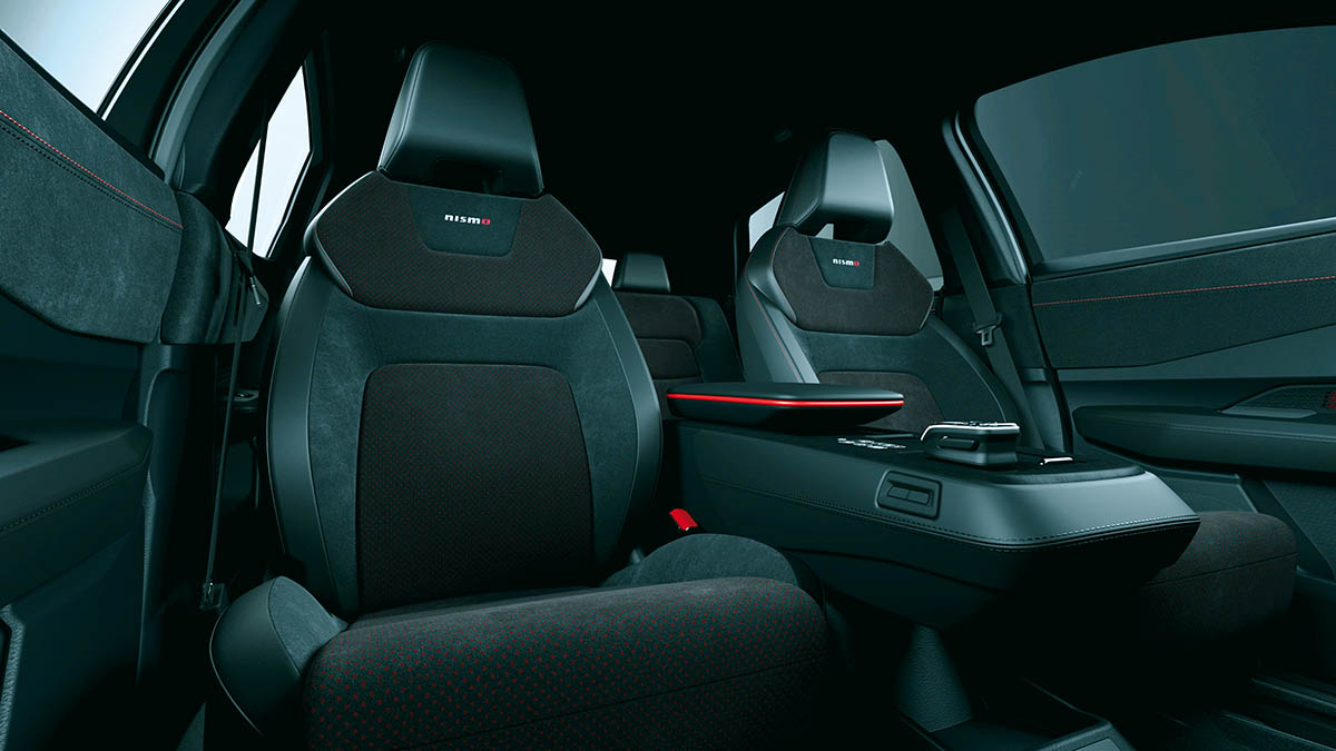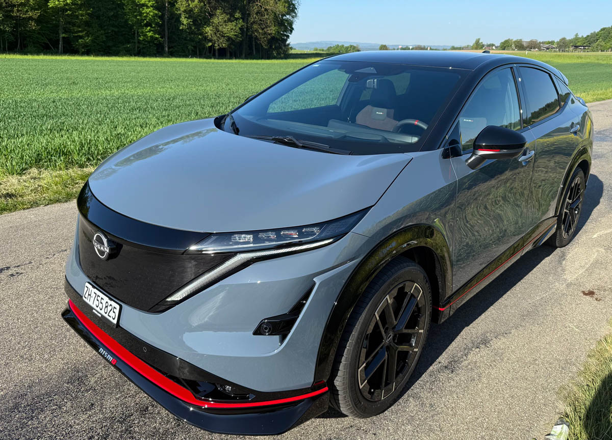 Die Bezeichnung «Nismo» hat bei Nissan im Motorsport Tradition. Erstmals so richtig auf sich aufmerksam machte dieses Kürzel im Zusammenhang mit dem 600 PS Supersportler GT-R. Auch das Juke-Topmodell erlangte den Ehrenkodex «Nismo». Um den Ariya die «Nismo» Gene zu verpassen, verbauten die Ingenieure unter der sportlich-eleganten Karosserie noch mehr Spitzentechnologie. Die Designer werteten die Äussere auf Schwellenhöhe mit einer feinen, roten Linie und an der Front sportlichen Elementen sowie hinten mit einem Heckflügel mit Diffusor auf. Dezent sind vorne und hinten «Nismo» Schriftzüge platziert. Auch im Innenraum sind die roten Designelemente und «Nismo»-Logos unübersehbar. Selbstverständlich sind die Ziernähte der gut geformten Alcantarasitze sowie das Lichtdesign rot geprägt. Im Ariya geniessen die Fahrgästen ein angenehmes Ambiente und üppige Platzverhältnisse. Die Materialien sind hochwertig und perfekt aufeinander abgestimmt. Das Cockpit entpuppt sich als sportlicher Arbeitsplatz. Alles ist übersichtlich und zweckmässig gestaltet.