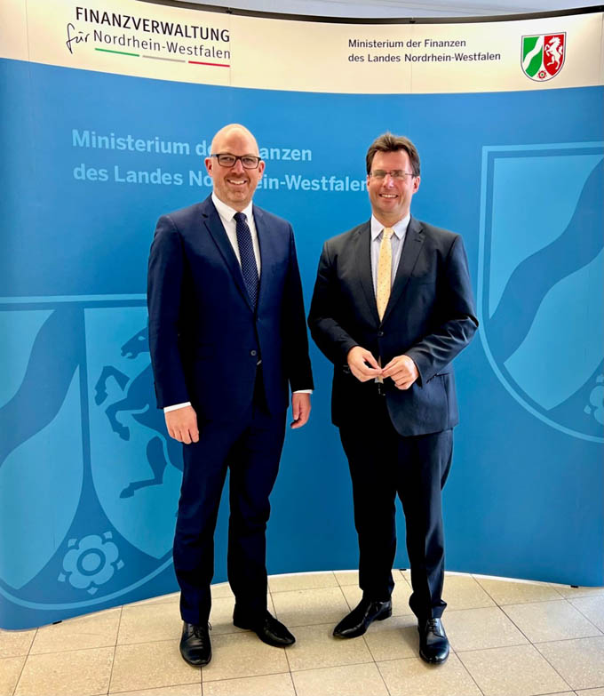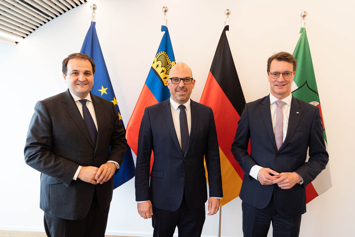 Am Mittwoch, 28. Juni stand die intensive Zusammenarbeit der beiden Industrie- und Wirtschaftsstandorte NRW und Liechtenstein im Fokus. NRW ist nicht nur das bevölkerungsreichste Bundesland, sondern auch das Land mit den meisten ausländischen Direktinvestitionen in Deutschland. Liechtensteinische Industrieunternehmen unterhalten in diesem Bundesland elf Standorte. So traf sich Regierungschef Daniel Risch zu bilateralen Gesprächen mit Ministerpräsident Hendrik Wüst, Europaminister Nathanael Liminski sowie Finanzminister Marcus Optendrenk. In den Gesprächen wurden die Herausforderungen der europäischen Wirtschaft und die Auswirkungen für den Nordrheinwestfälischen und den Liechtensteinischen Wirtschafts- und Finanzstandort thematisiert. Daniel Risch betonte dabei die Notwendigkeit gut funktionierender, nachbarschaftlicher Beziehungen zwischen Liechtenstein und den deutschen Bundesländern.