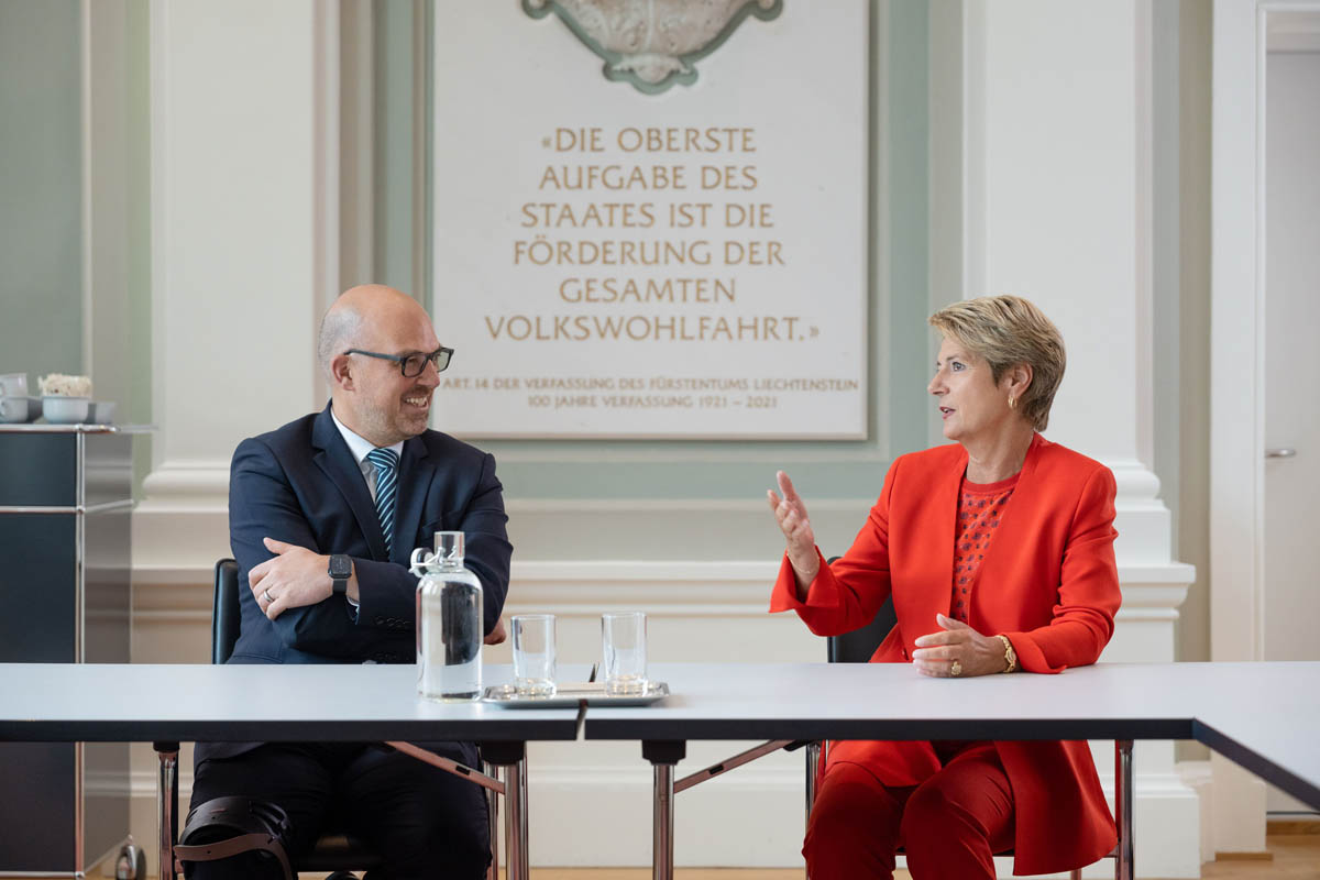 Am Vormittag des Dienstag, 21. Mai 2024, empfing Regierungschef Daniel Risch die Schweizer Bundesrätin Karin Keller-Sutter im Regierungsgebäude zu einem Arbeitsgespräch. Das Treffen fand im Vorfeld des 10. Finance Forum Liechtenstein im Vaduzer Saal statt. Beim bilateralen Gespräch tauschten sich die Finanzminister unter anderem über die nationalen und internationalen Beziehungen im Finanzbereich, die Finanzmarktregulierung sowie Steuerfragen aus.