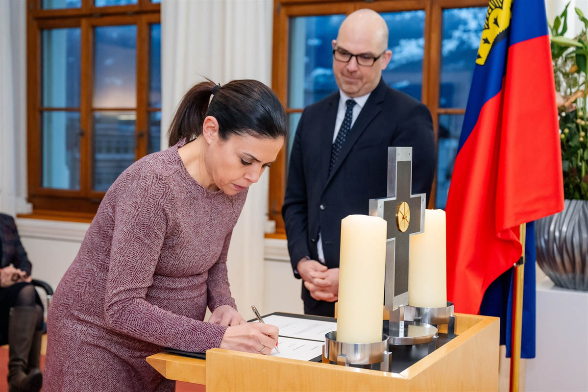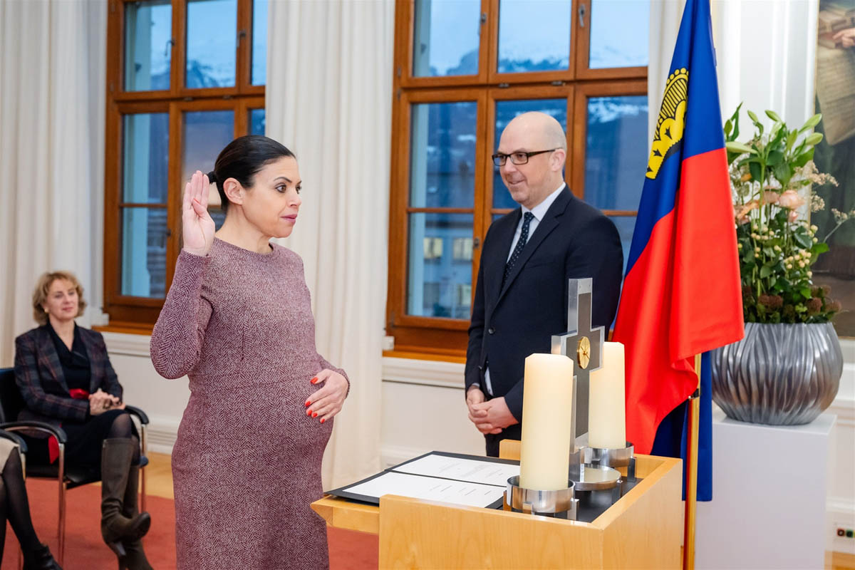 Judith Hoop ist am Dienstag, 23. Januar 2024, im Fürst Johannes Saal im Regierungsgebäude von Regierungschef Daniel Risch als Regierungsrat-Stellvertreterin vereidigt worden. Die Betriebsökonomin ersetzt Patrik Oehri, der seine Funktion als Stellvertreter von Gesellschaftsminister Manuel Frick aufgrund seiner Bestellung zum Stiftungsratspräsidenten des Liechtensteinischen Landesspitals nicht länger ausfüllen kann.