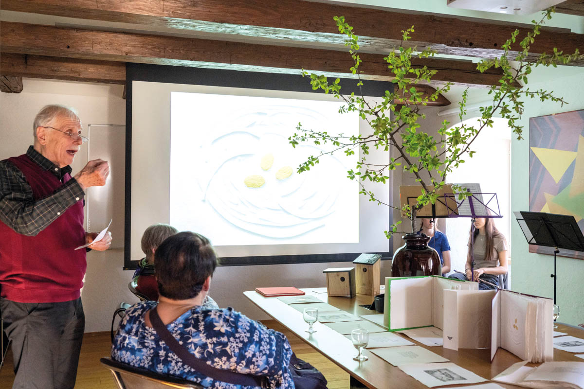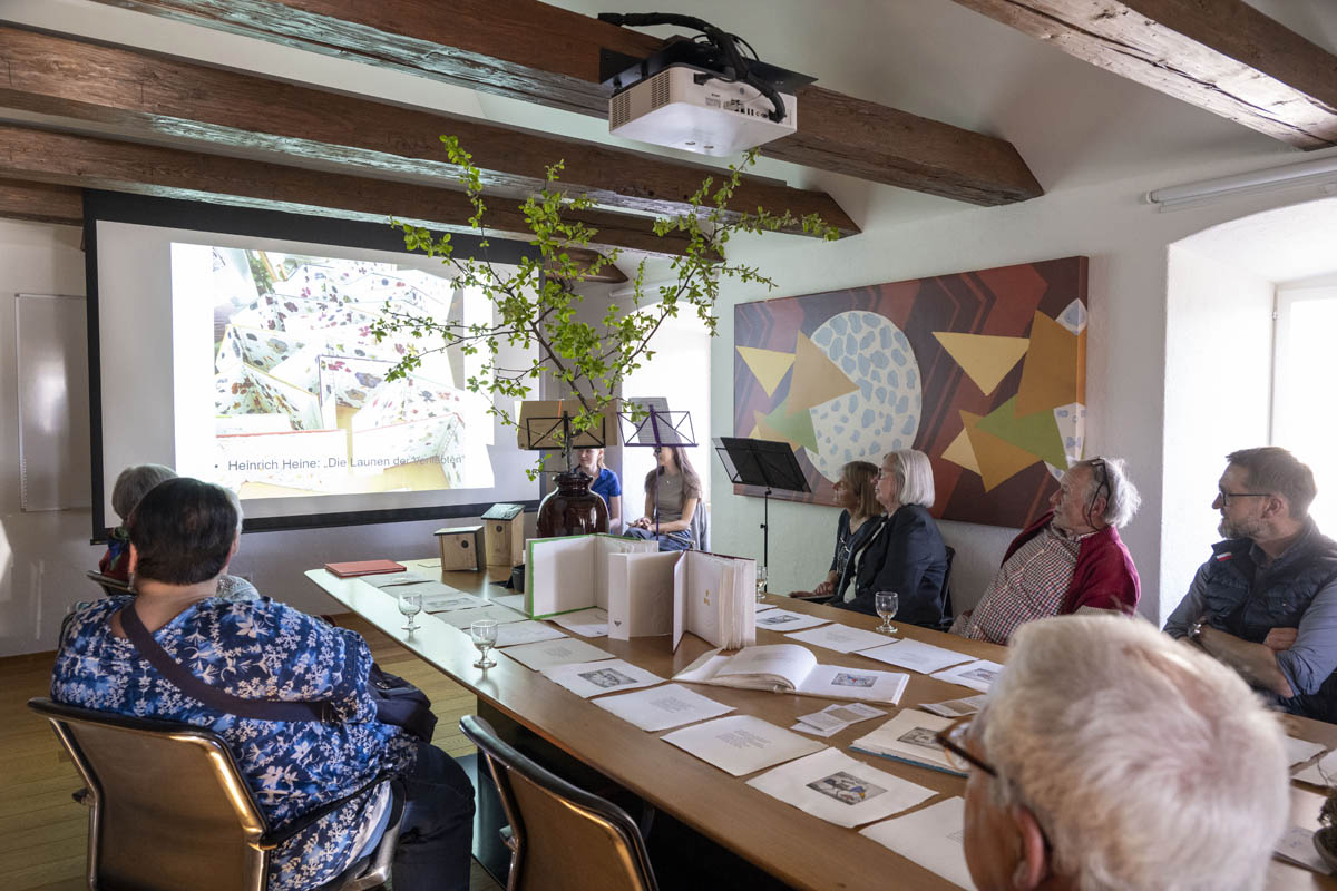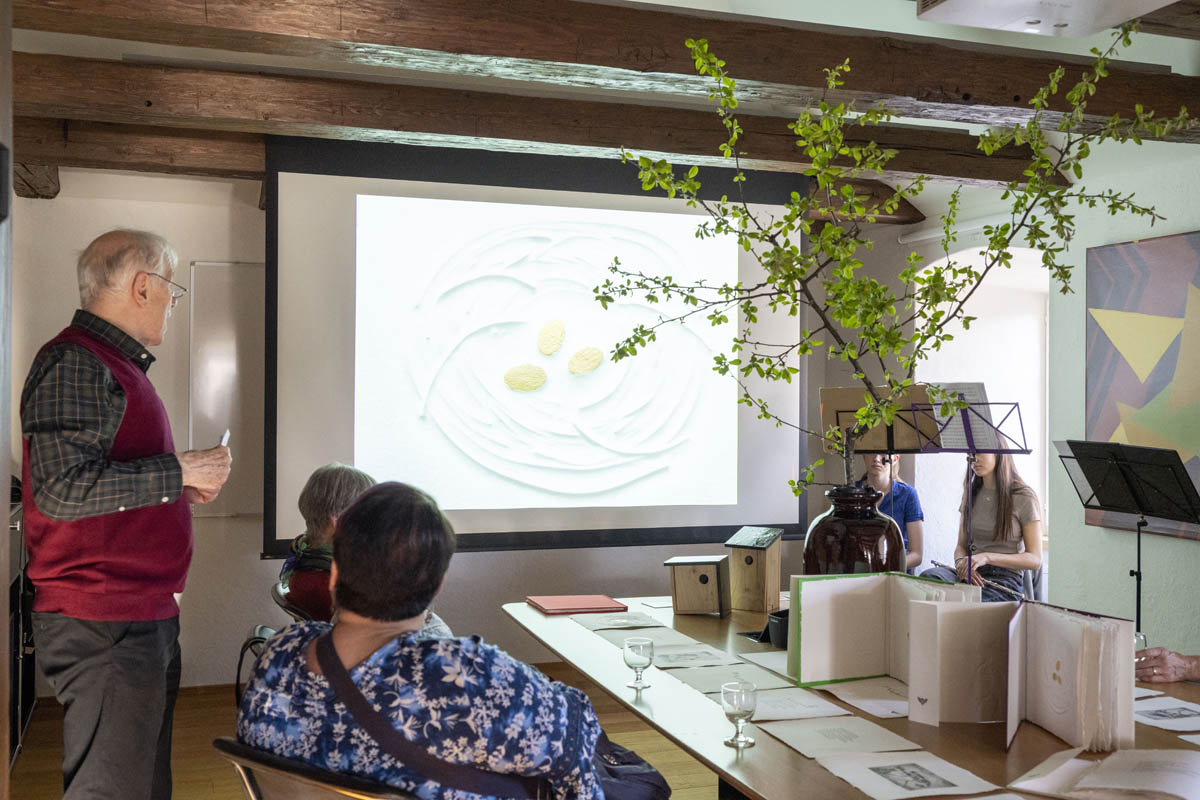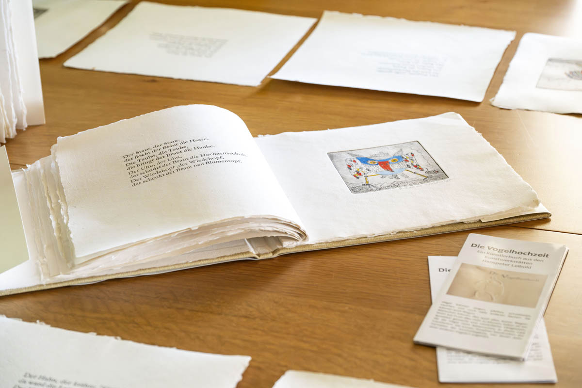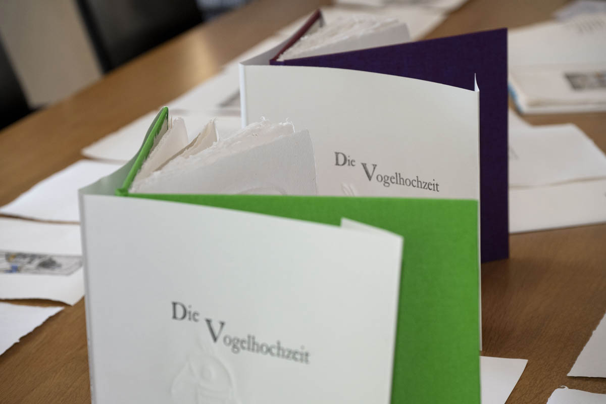 Die Bindung erfolgte in japanischer Blockbindung, in Schweizer Broschur, mit vierseitigem Büttenrand in einem Hardcoverumschlag aus Leinen.