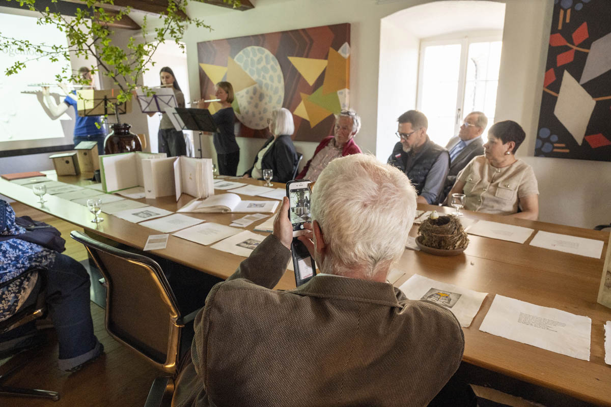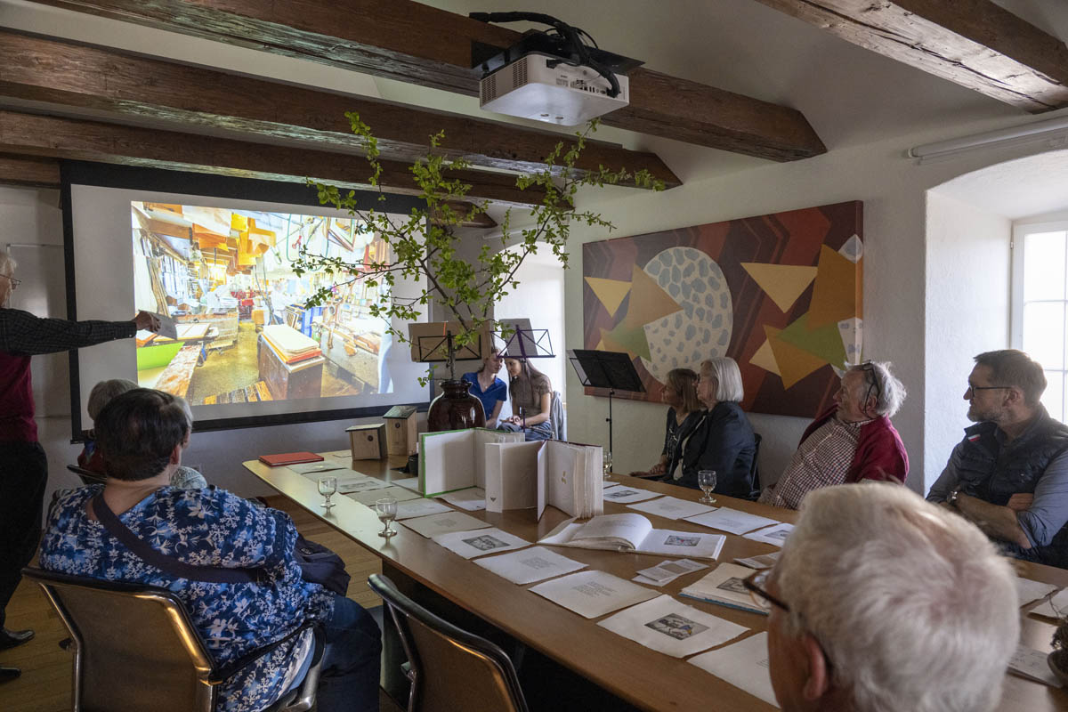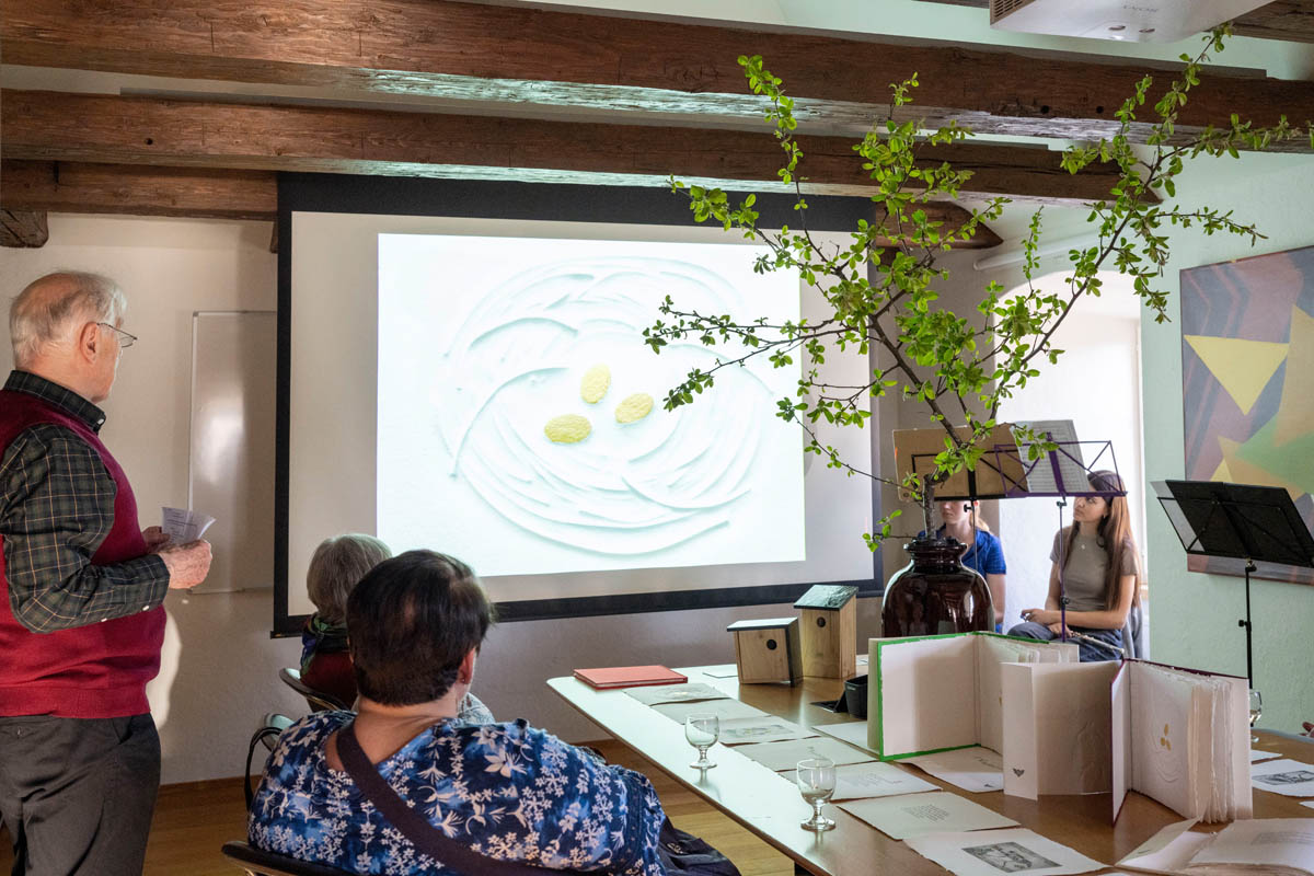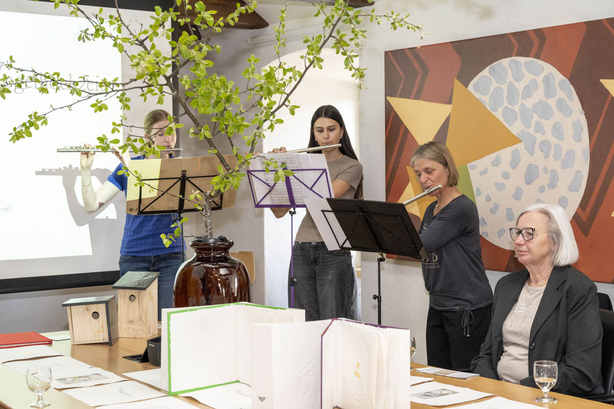 Die Bindung erfolgte in japanischer Blockbindung, in Schweizer Broschur, mit vierseitigem Büttenrand in einem Hardcoverumschlag aus Leinen.