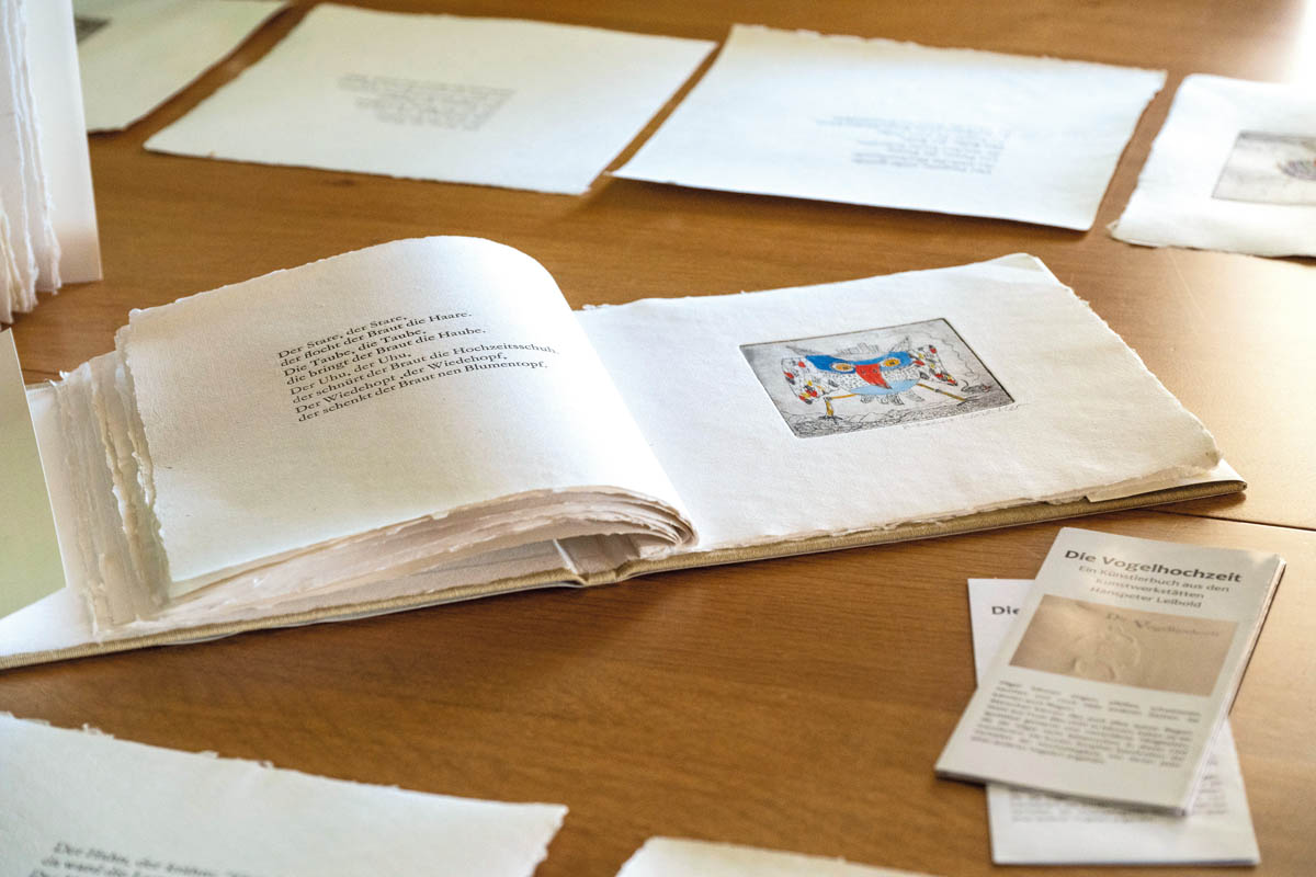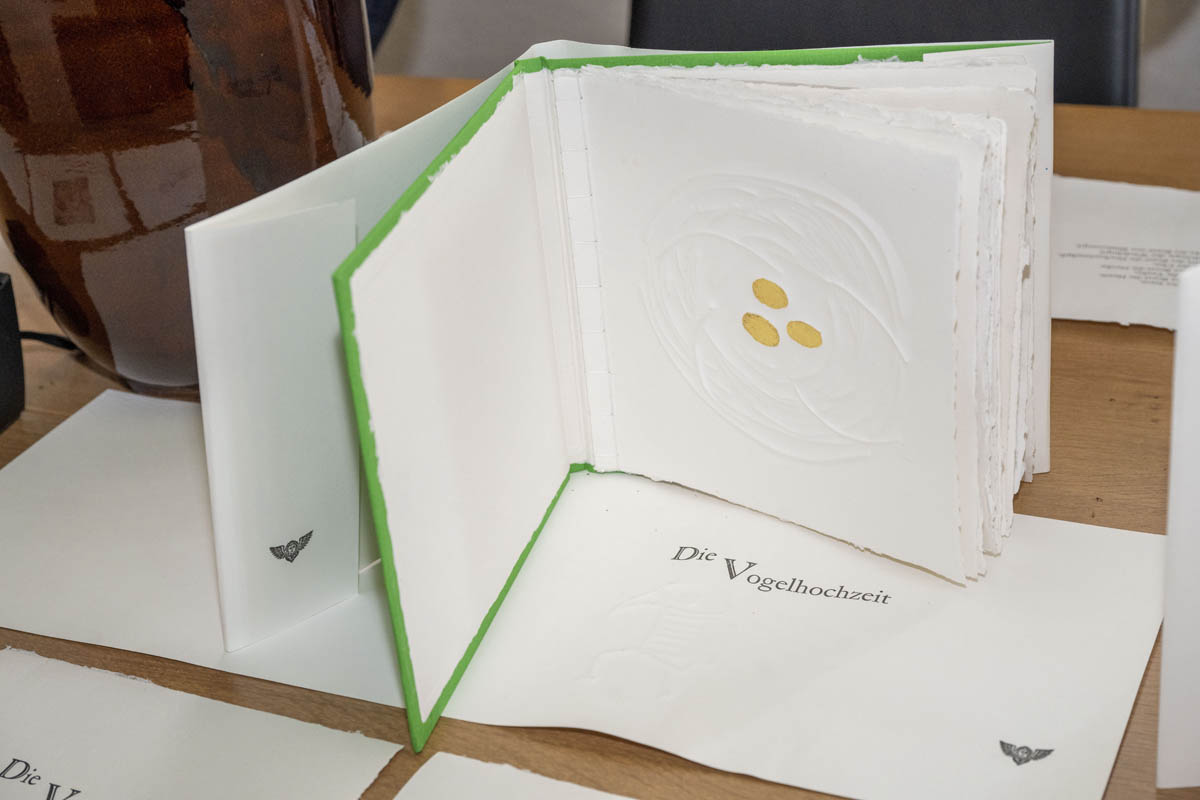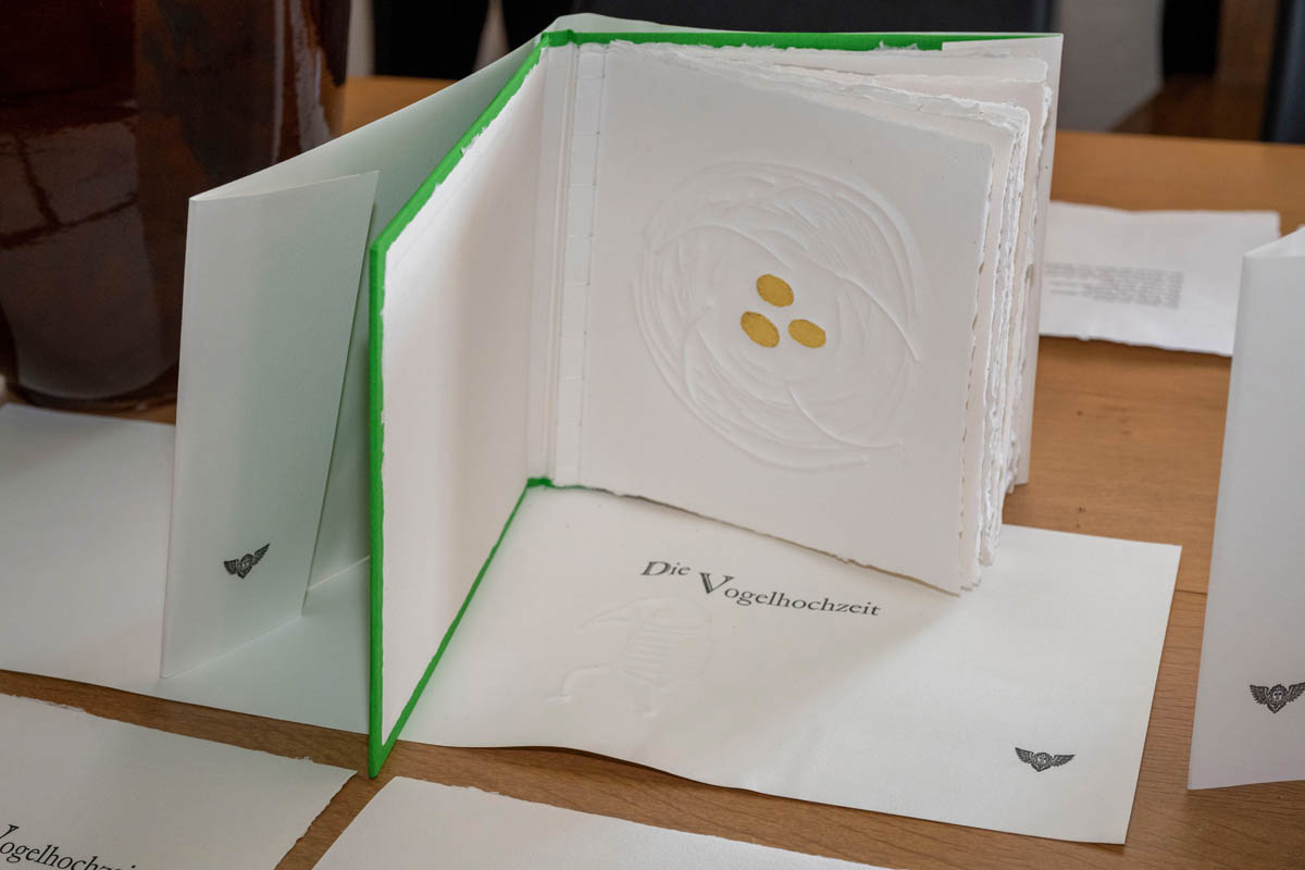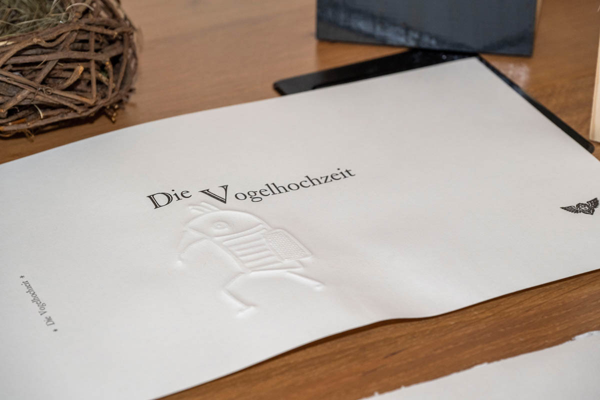 Der Text wurde handgesetzt, im Buchdruck und auf dem Kahle Handtiegel Nr. 2282 gedruckt. Das Buch beinhaltet auch mehrstufige Handblindprägungen. Die Vergoldung ist in 24 Karat.