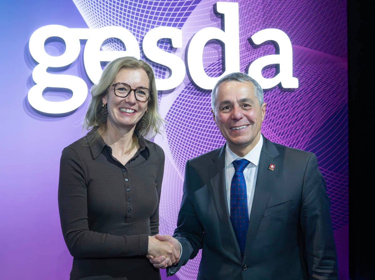 Der Schweizer Bundesrat Ignazio Cassis begrüsst Regierungschefin-Stellvertreterin Sabine Monauni am GESDA Summit in Genf.
