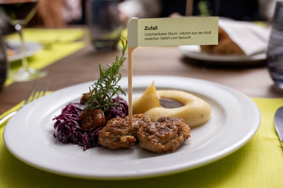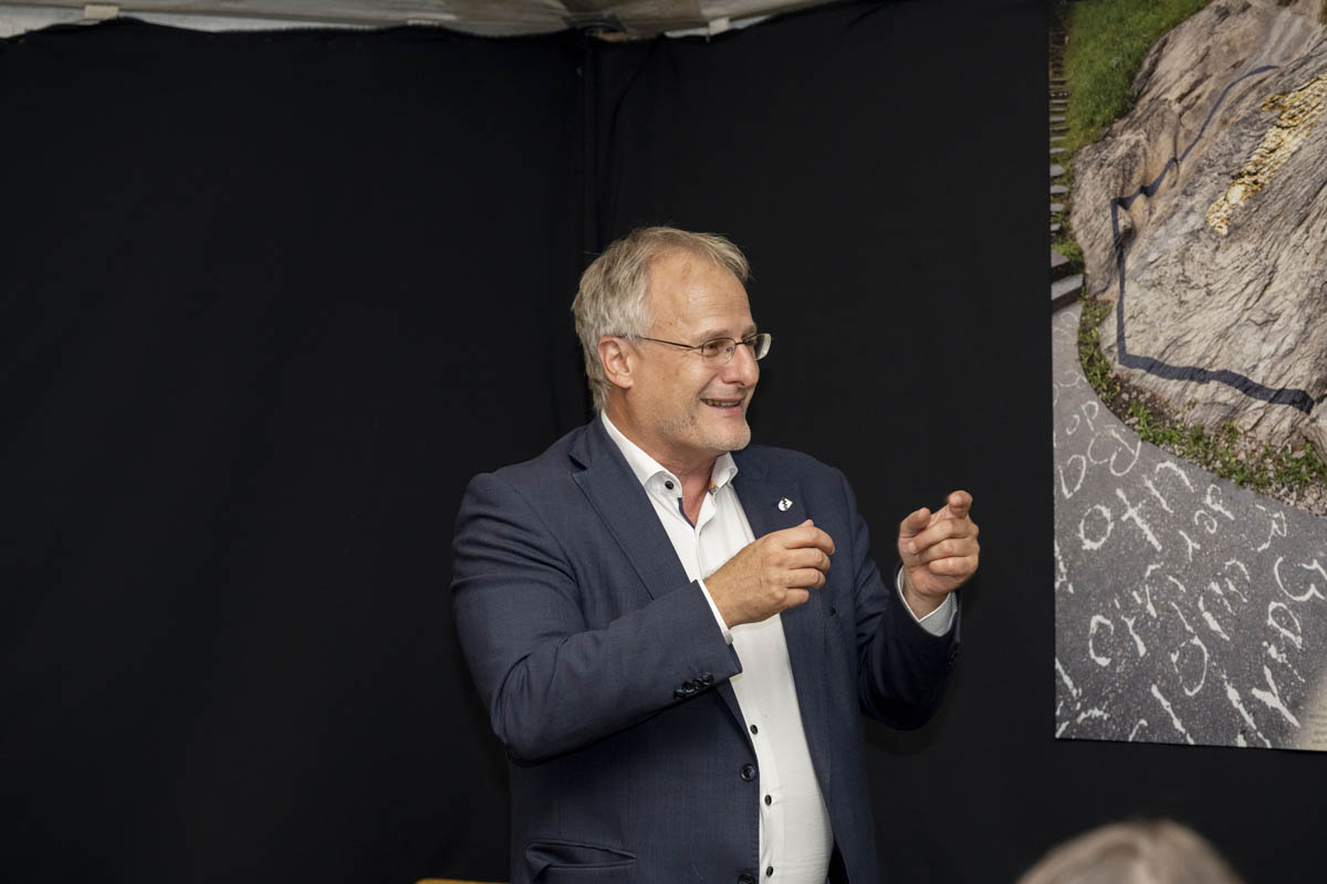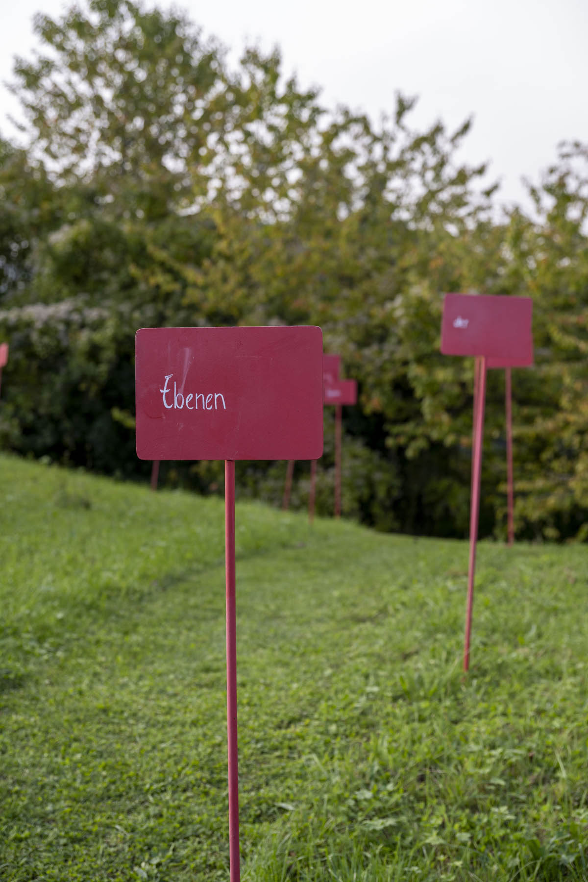 Gert Gschwendtner vergleicht den Hügel mit einem grossen Blätterteig aus Gedanken: eine Vielzahl von Ideen, Beobachtungen und Reflexionen, die sich zu einem Ganzen verbinden. Ruhe und Stille werden bewusst geschaffen, um in der heutigen, von Informationsflut geprägten Zeit einen Gegenpol zu setzen. Besonders symbolträchtig ist der Sisyphos-Stein. Er erklärt: «Der Sisyphos wirft den Stein nicht, er verliert ihn, und der Stein rollt den Berg hinunter. So entsteht ein Weg – ein Zugang zum Berg.» Der Stein steht für die Überwindung scheinbarer Aussichtslosigkeit und für die geistige Kraft, die notwendig ist, um Hürden zu bewältigen. Auf ihm ist zu lesen: Mut und Freude des Sisyphos.